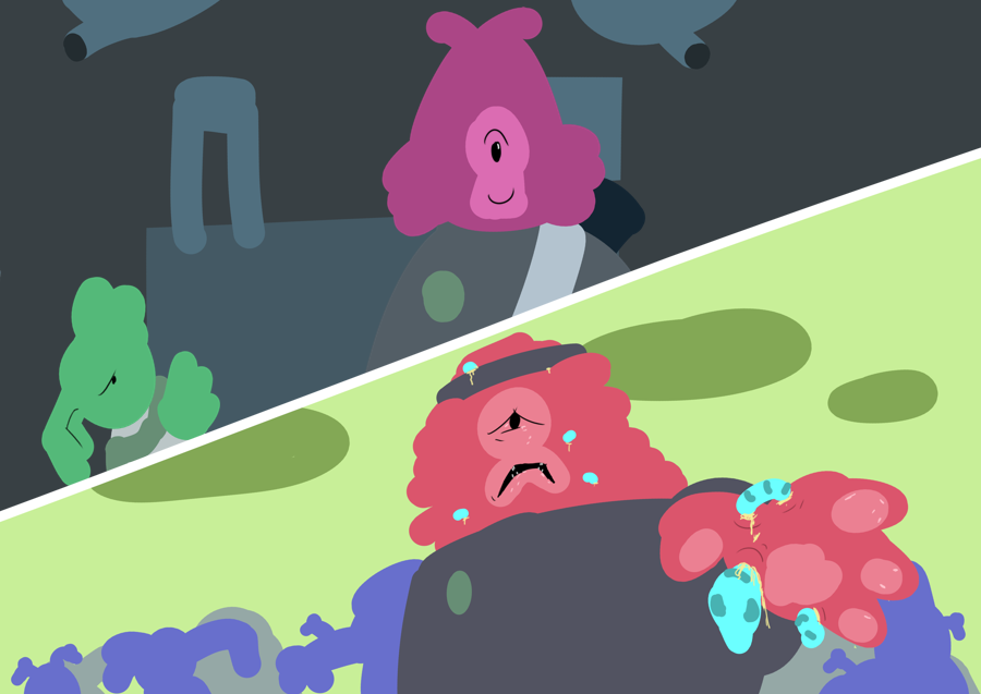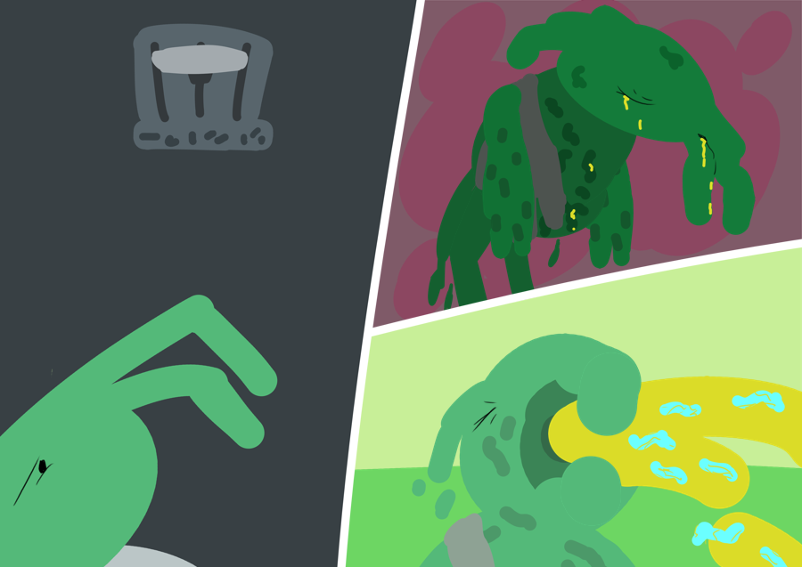 You've never seen someone infested with the worms in person like this; it's even worse then you thought. The worms, Kuku worms, are a bioweapon directly created by the Aristocrats. You see them wriggling beneath their flesh; the holes open in their skin where the worms burrow in or release fluid, filled with microscopic eggs. They can live anywhere; hiding under logs or stones or in mud, just waiting for the flesh of a large-bodied creature to get within striking distance. Once inside the host; they create more eggs and start eating its host from the inside out, before seeking to aggressively spread them to the next victim. The entire group is infested with them; out in the field and unable to communicate or have the worms medically removed before it was too late.But the reason the parasite is so feared, and so aggressive to be used as a weapon, is because it hijaks the body and mind of its host, slowly turning them into a zombie capable of spreading this infection. This group of worm-zombies even sent out the captain to the front, the least turned, likely so you'd get closer. The rest are no longer even visiably alive. They shuffle towards the open door with newfound speed.”AHHH! THEY'RE RIDDEN!”You flap your wings up and panic, running from the doorway in a hurry. Dole raises up his gun, but hesitates.“My... My friends...”