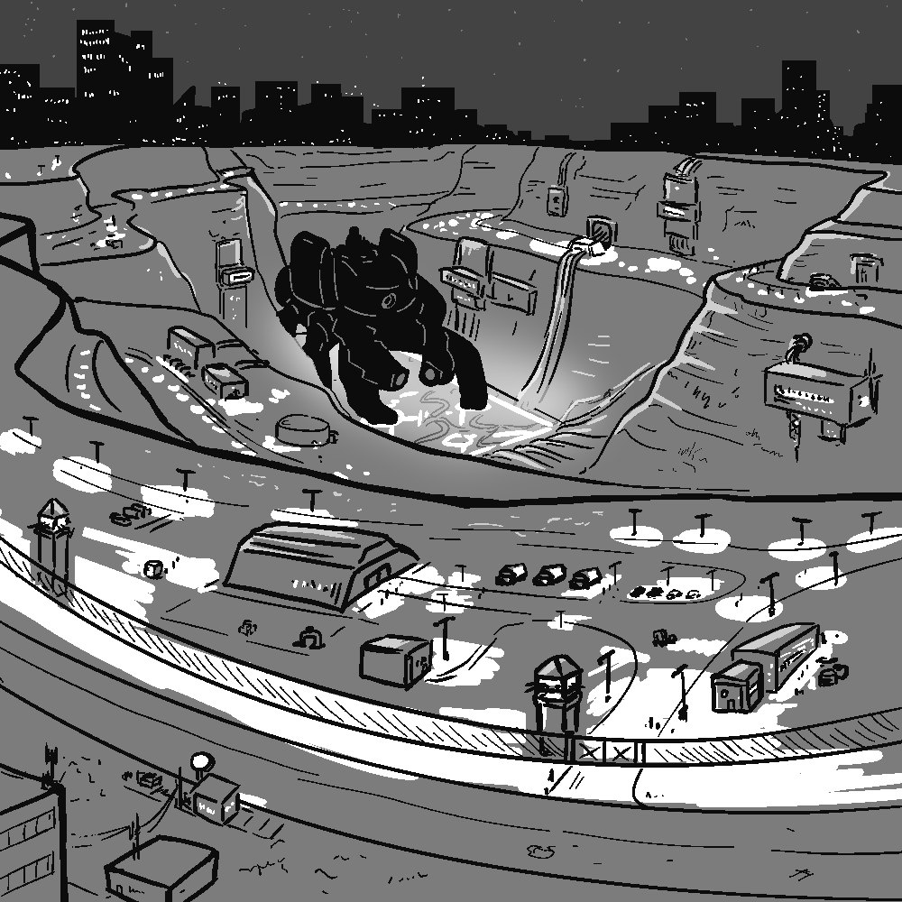 You.. try not to judge much, despite the growing headache.– "Okay.. just don't go on a murder spree on the middle of a stealth mission."The militant fujo rapidly shakes her head, ears flapping.– "No, no, don't worry. If I kill all humans, no one will be left to write more BL. I don't really.. you know.." Psy pauses and hangs on tight to Rayle while you all jump the gap between rooftops. "..if you want all the uh.. meat to yourself, then, uh, go ahead, I'll pass."You inform Psy that you or your minions haven't been into people-eating much, and then return the conversation to the practical track. – "Okay, okay, so you can do long-range comms? With your mind? Could you put us all on the same channel?"– "Uh, no, I can speak into your head and listen to your answer, and that's kind of it.. I've been using it to annoy Snail Guy and not much else.."Rayle shrugged.– "Could be useful. But if you try to mind control me, I'm punching you. A lot."You chime in right after the casual threat.– "Can you call IO that way?"Psy shuffles awkwardly.– "I didn't establish contact with him that way. I uh.. r-really don't wanna get into his head.."Understandable. You let the matter drop and focus on jogging.***The gang is planted on the rooftop outside the ritual site. You can actually see most of the inside from this vantage point, which reminds you that this place usually isn't used for anything military-related, just infrastructure. Well, not today. It's a big open-air area with several buildings that slopes down in large steps. Workers and vehicles move around, floodlights illuminate the area. Roughly in the middle, at the deepest point, there is a ritual square covered in thick cables and glowing lines. A towering, crab-looking war mech is standing there. Humans really are preparing for war. Good thing you're about to steal that mech's would-be power source. The muffled explosion sound perks all of you up. IO must have begun his "walk." By his own admission he's not immortal or all-powerful, and he usually wins fights by only taking the fights he can win. Translation: he'll pull a lot of people but retreat if the risk becomes too much. You're on a timer. Five feds in their usual formalwear (and shades at night) exit the main gates with their cases ready. They have a brief hurried conversation, leave one woman at the gates, hop on an army APC, and rush towards the action. Several more cars soon follow out of the gates. No hero presence it seems, feds and heroes never got along.It was time to go. Your target is the ritual square.