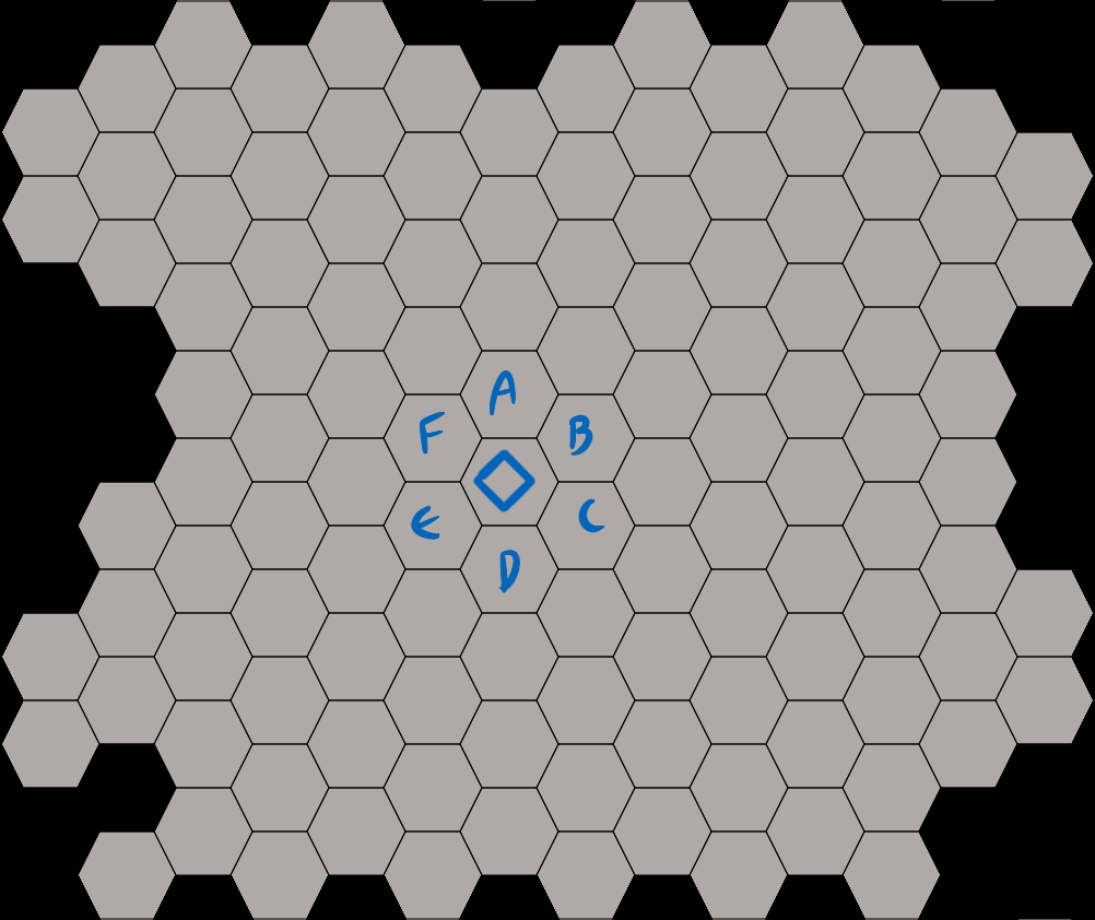 >>6396705>>6396706>>6396733>>6396738Awesome art and concepts everyone! Happy to have you all aboard!Since I have you all here as my captive audience, I thought now would be a good time to discuss movement and line of sight.To start with the former, due to the fact that this game’s pathing is often important (most notably in leaving trails of Magelights as you walk), I’ve opted for a relative coordinate system through which you can precisely communicate your movement. [Of course, if you don’t want to deal with this, you can simply download the map and draw your desired path.Each of the 6 directions on the hexagonal grid are represented by a letter, starting at the top and proceeding counterclockwise, they are labeled A, B, C, D, E, and F, as shown on this graph.