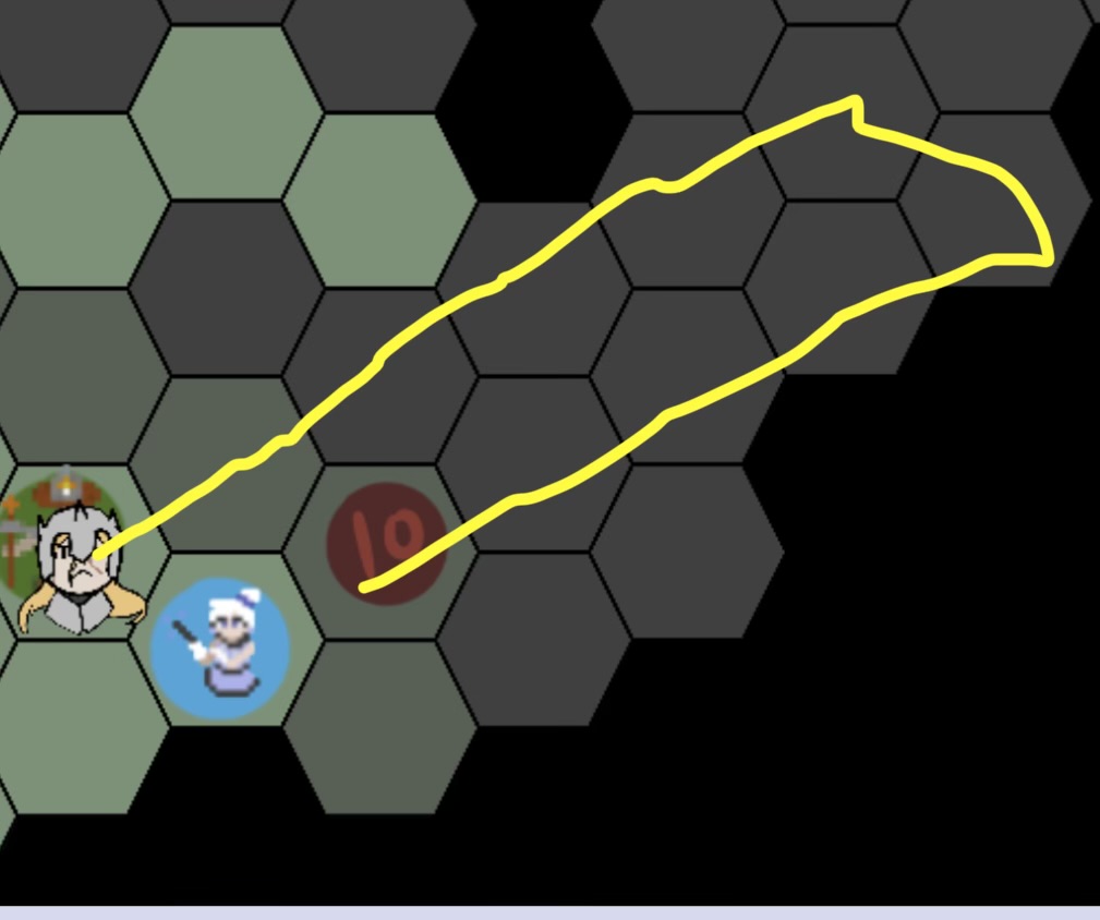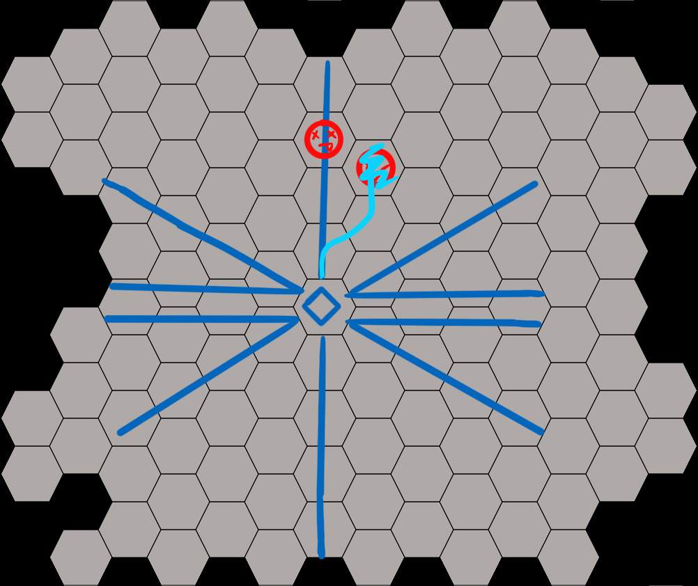 >>6396750>>6396751Explaining LINE OF SIGHT, unless otherwise stated, spells can be shot in 10 distinct directions: your normal hexagonal directions (A, B, C, D, E, and F) and your four new horizontal directions. To communicate which horizontal direction you want, you can either state “Horizontal” plus the LETTER direction the line emerges from [e.g. Horizontal B] or just provide a reasonable description [e.g. Horizontal high right]As shown in the diagram, it’s impossible to hit an enemy outside of your line of sight without using your movement to reposition. To ameliorate this, some sigils allow you to manipulate your spell’s trajectory.