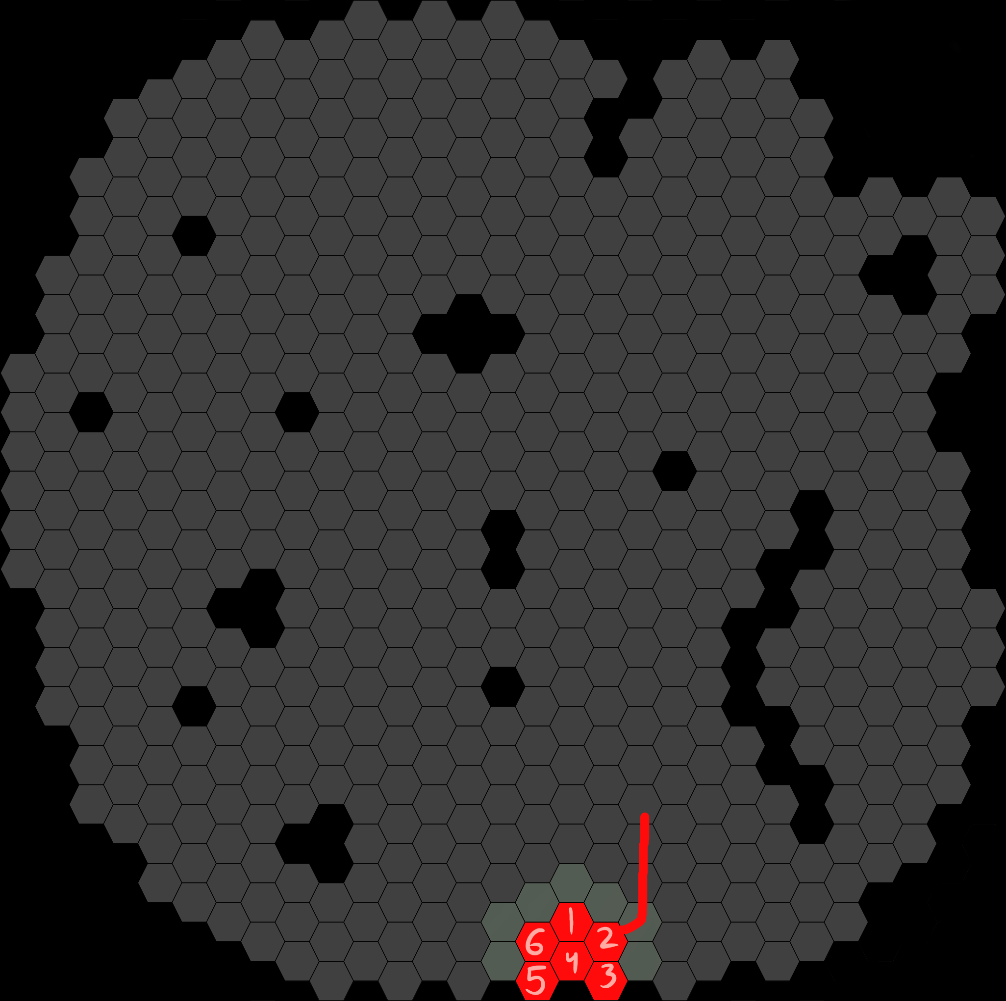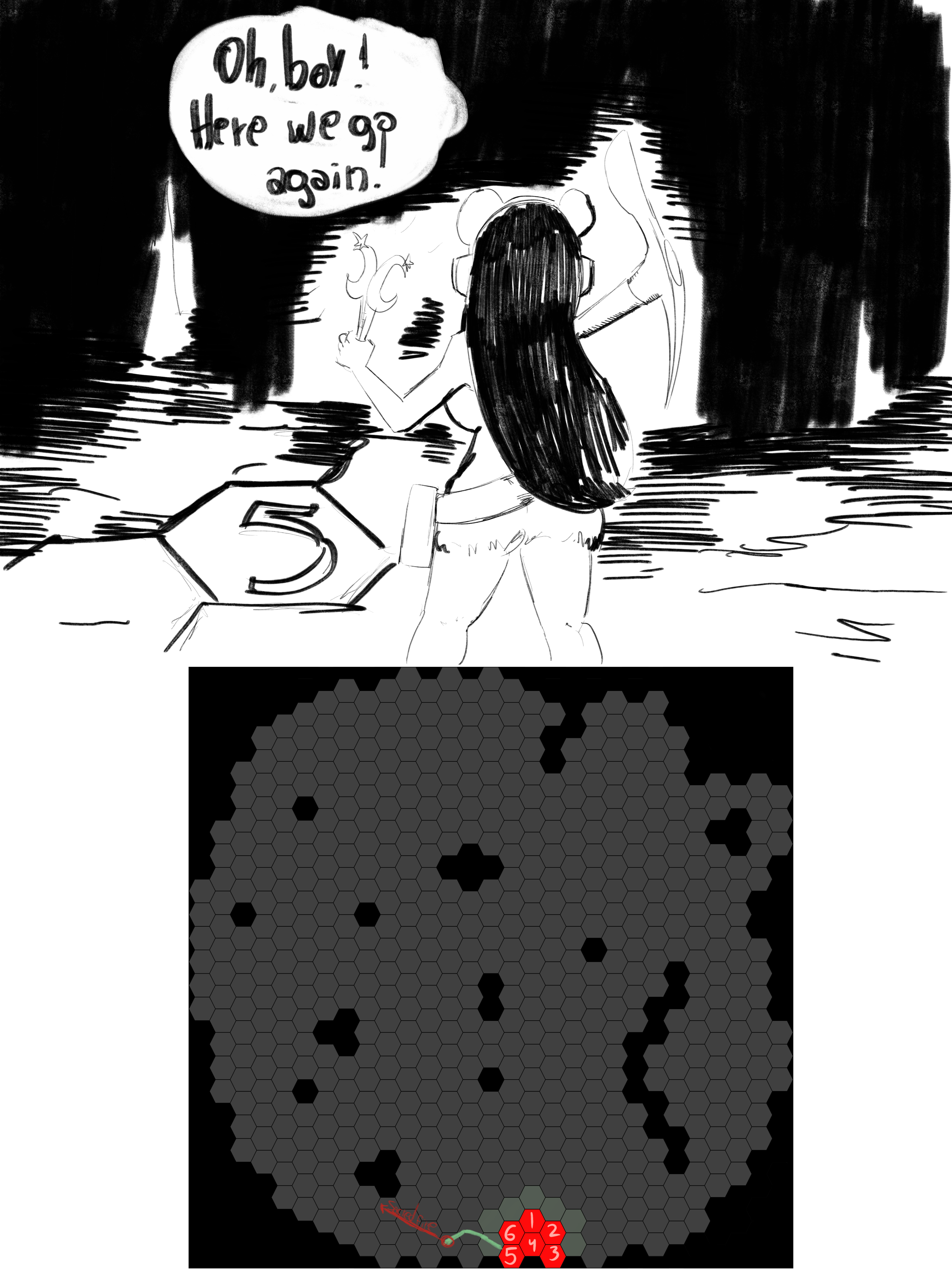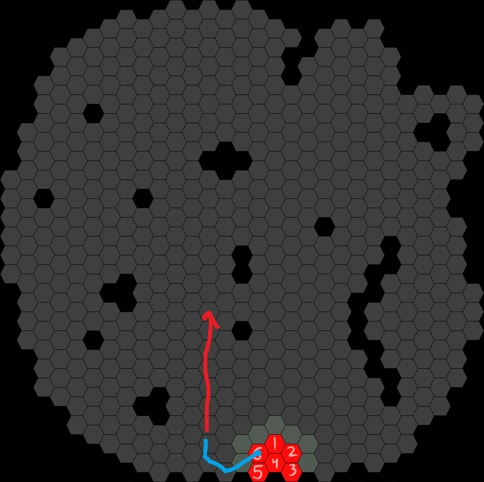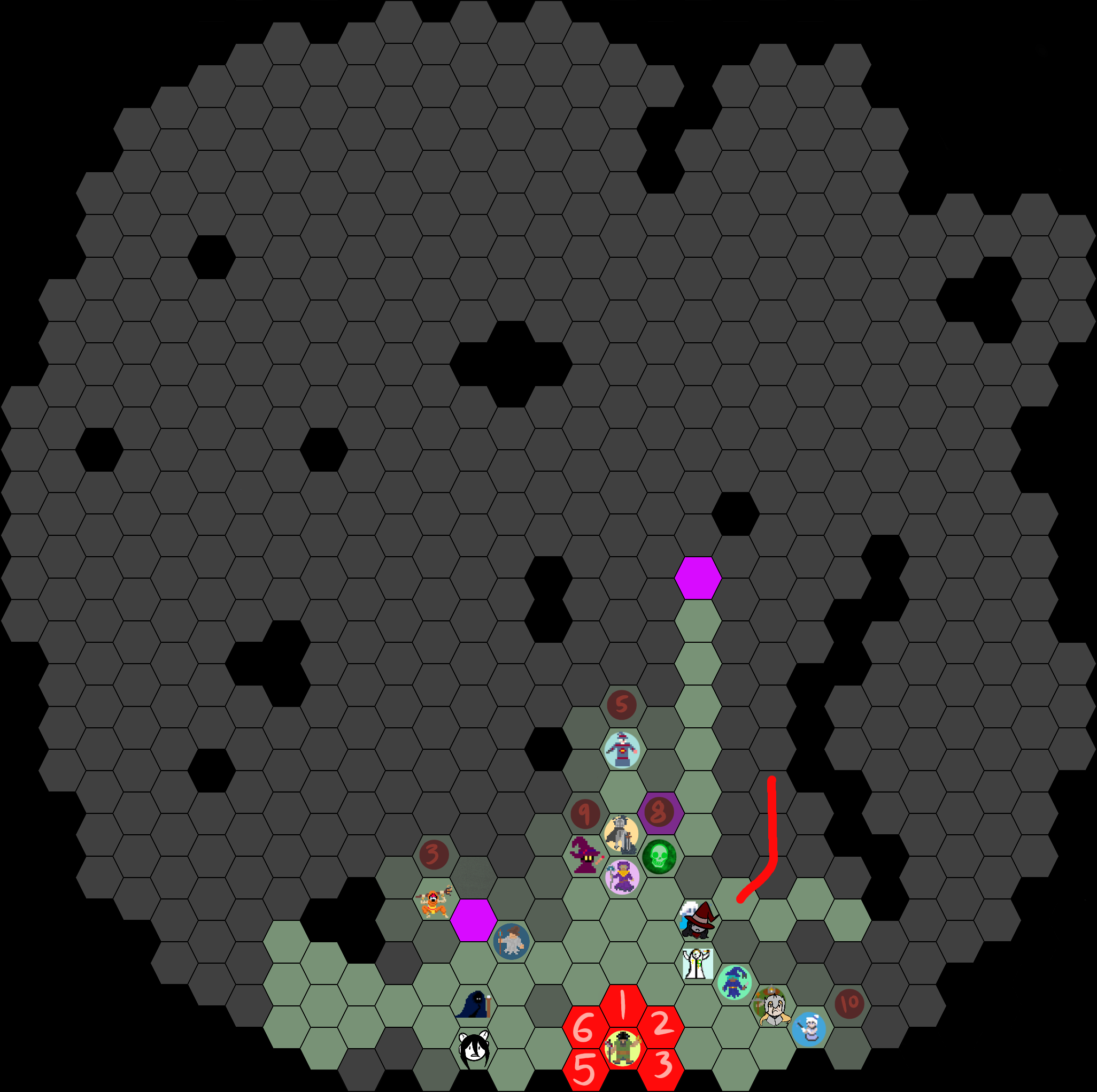 I hope this is clear enough >>6397254Cookie starts on hexagon 5.The green line shows where she moves.The red line is #Sacred Fire#. She wants to light the path ahead.