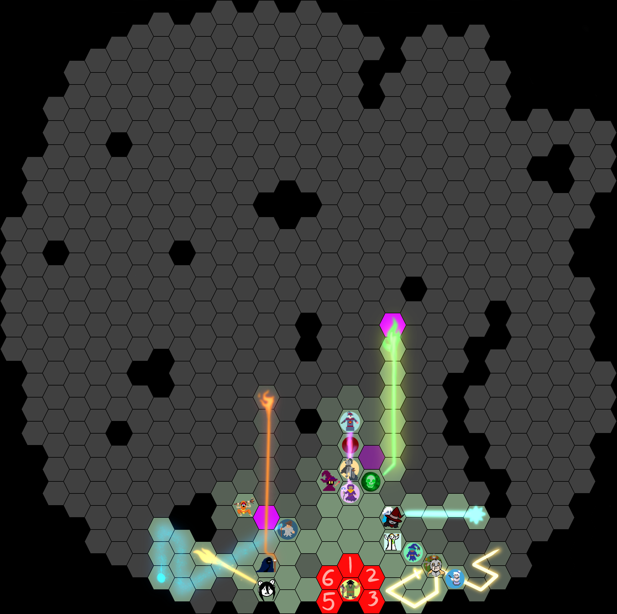 The Dawnseekers begin their first mission, each and every one showing their unique approach to Diving as they explore this unknown territory. Some dash bravely forward, valiant THORNE, bloodthirsty ALARYCK, and the ever-reckless elder of the prestigious Ireqqen form the vanguard. Others cast grand spells into the dark, hoping to smite a rodent with a lucky shot. Some stay towards the rear, waiting for their more eager comrades to light the way before they proceed. Dark-hooded EIGENGRAU blasts flames into the abyss, temporarily illuminating it in a baptism of orange magic, while CONQUEST throws out a truly devastating burst of flame, hitting nothing but leaving behind a glittering cascade of magelights in the wake of her attack. Fearless ROA, standing nobly in front of HURDY, supplements his lack of offensive magic with her own, firing a bolt of mana and sweeping the entire nearby area, trying to ensure everyone stays safe. JOROGUMO also slings a spell, a piercing lance of pure mana, but can feel in the feedback that no beast was felled.[NOTE: ONLY SPELLS THAT COULD HIT TARGETS OR ILLUMINATE OTHERWISE AT LEAST ONE TILE THAT WOULDN’T BE ILLUMINATED OTHERWISE ARE SHOWN. SPELLS WITHOUT TRAJECTORIES (Cast in melee range, cast on self) WILL NOT BE SHOWN UNLESS THEY LAND.]