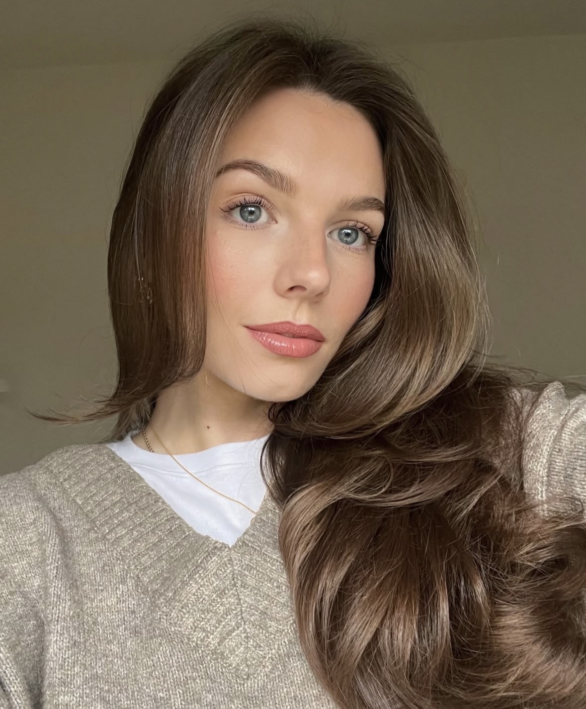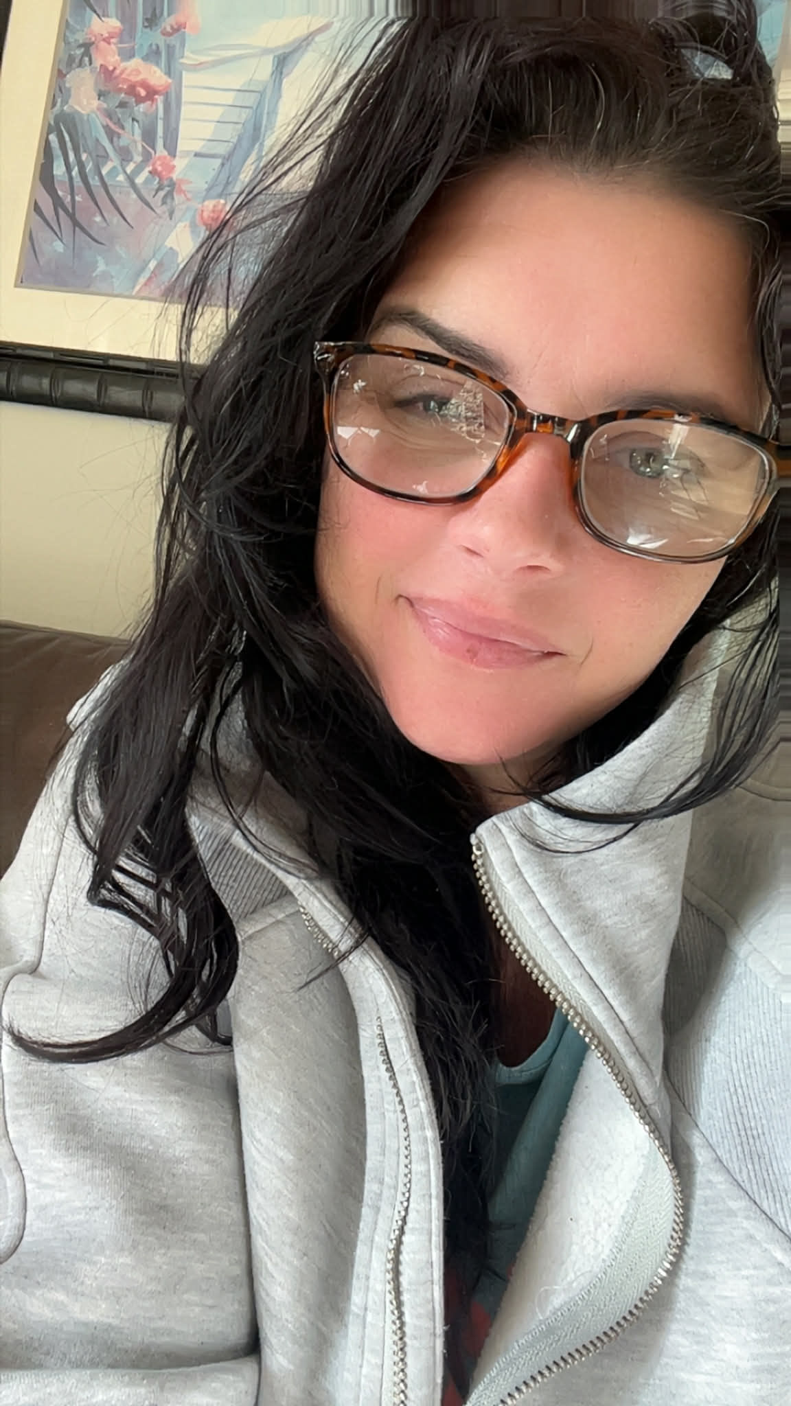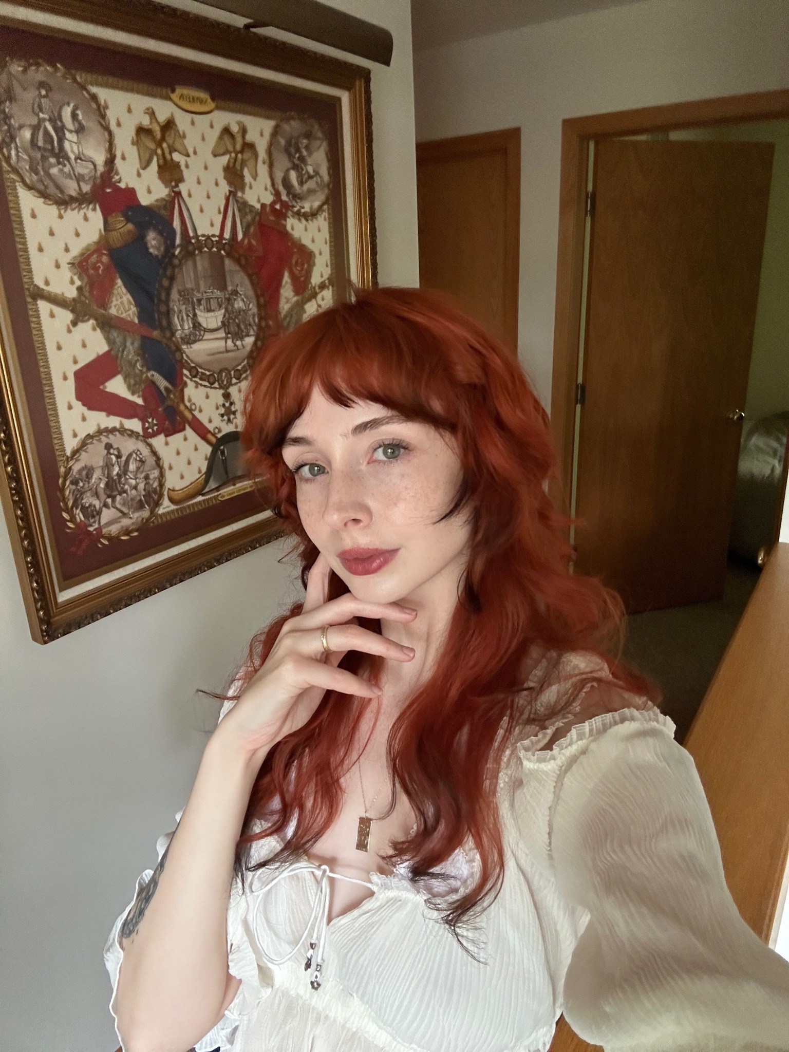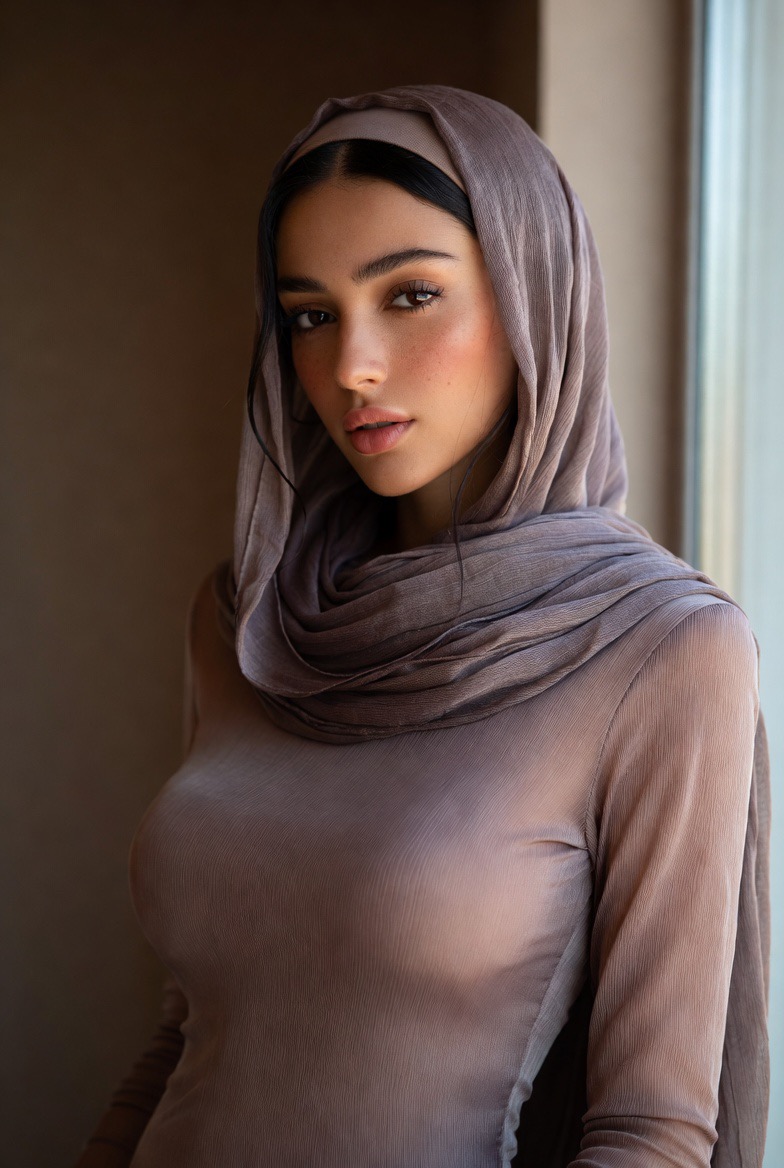 Wizards, please animate this woman lifting her sweater with her right hand slightly enough to reveal her breasts while still holding her phone with her left hand. Thank you.