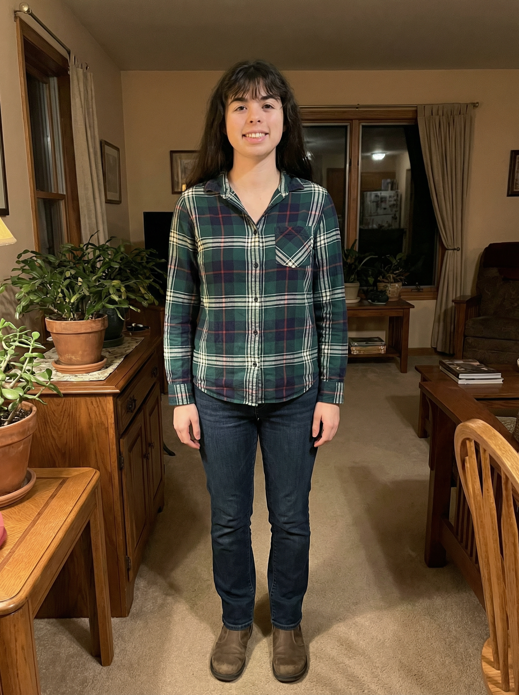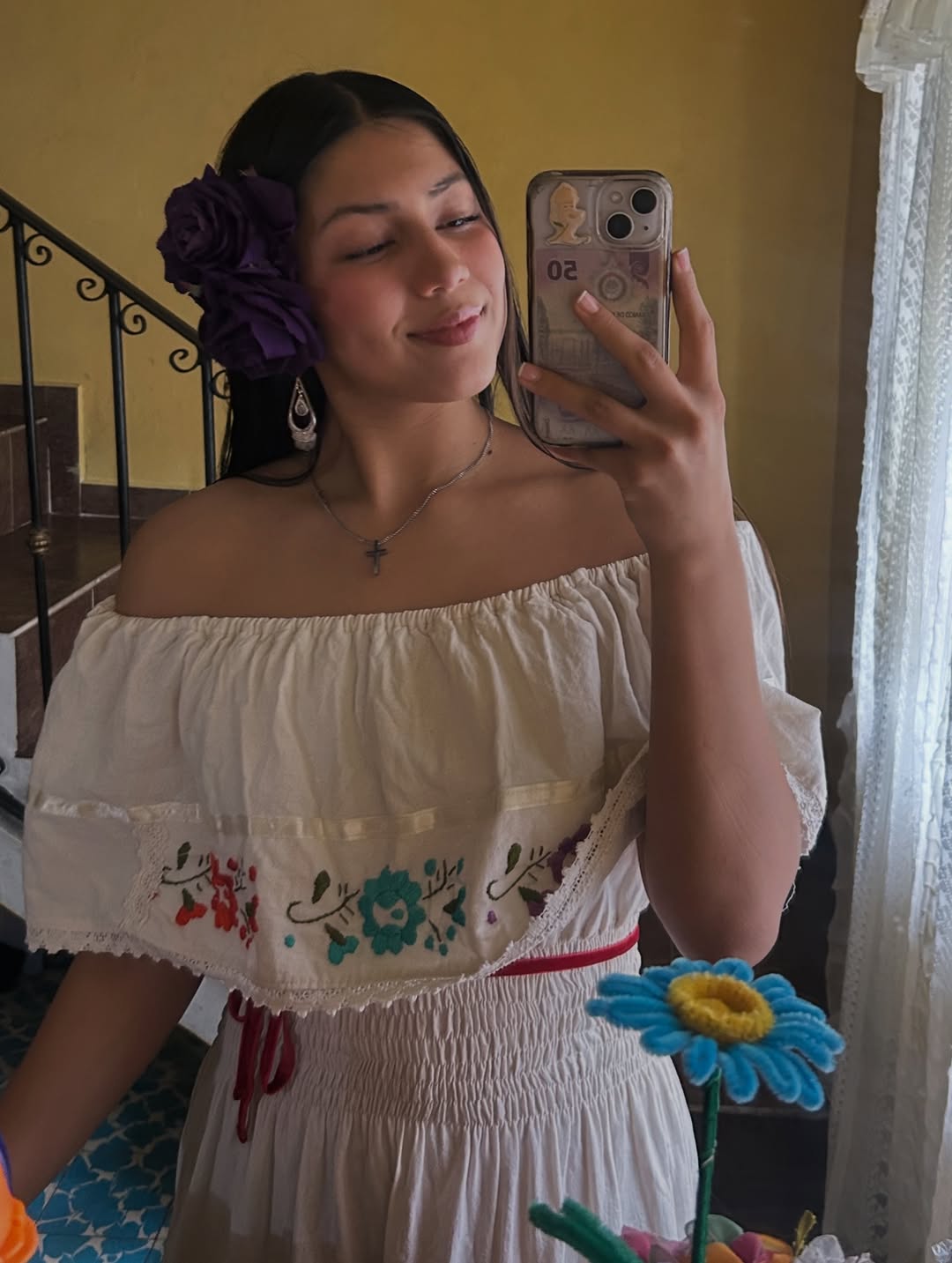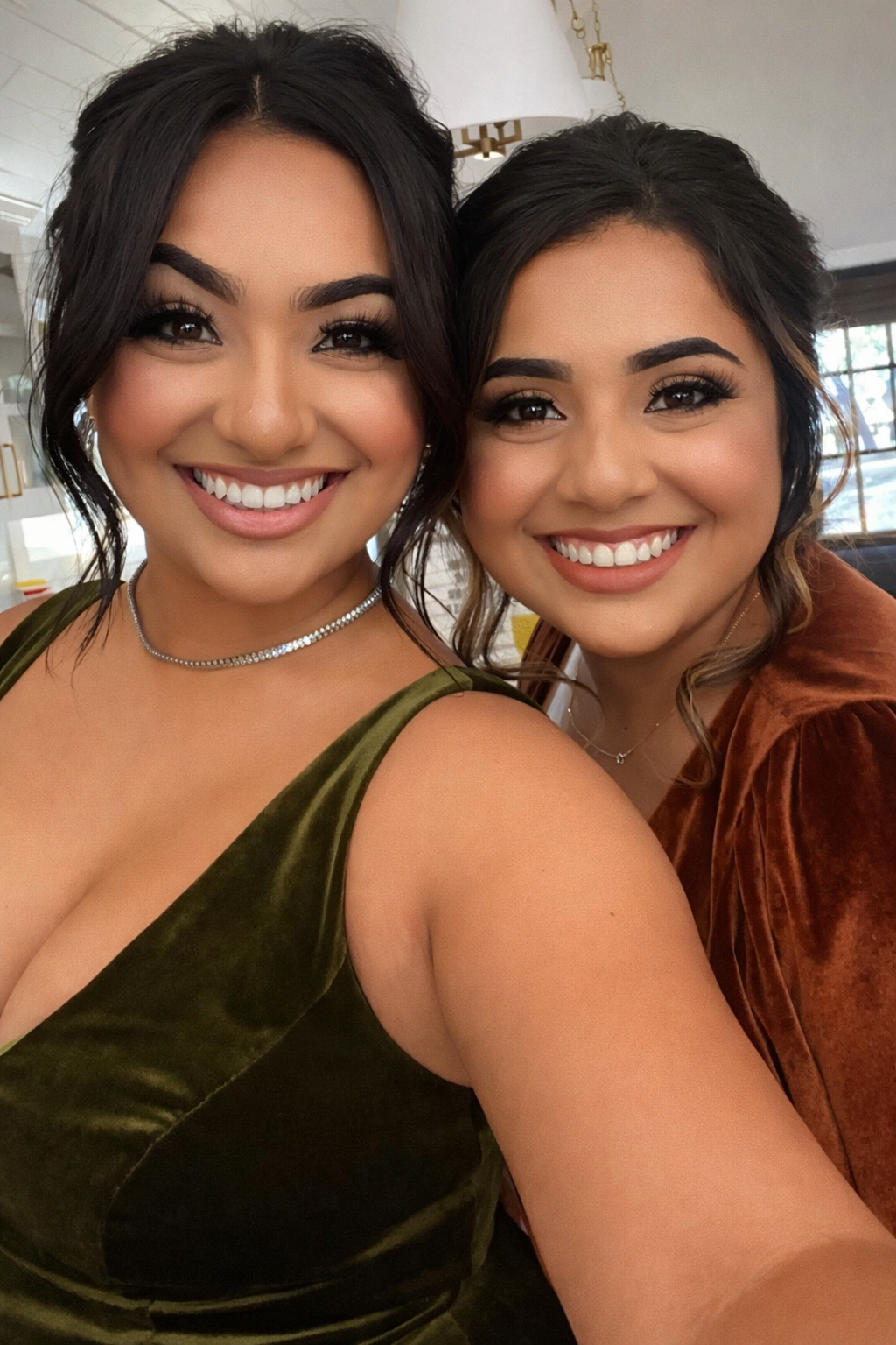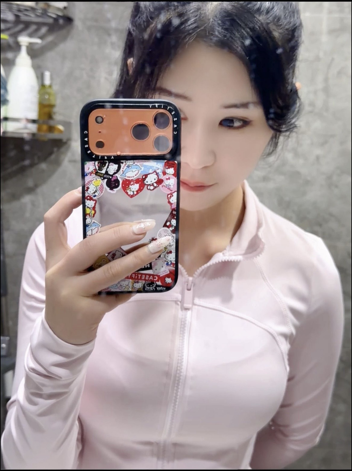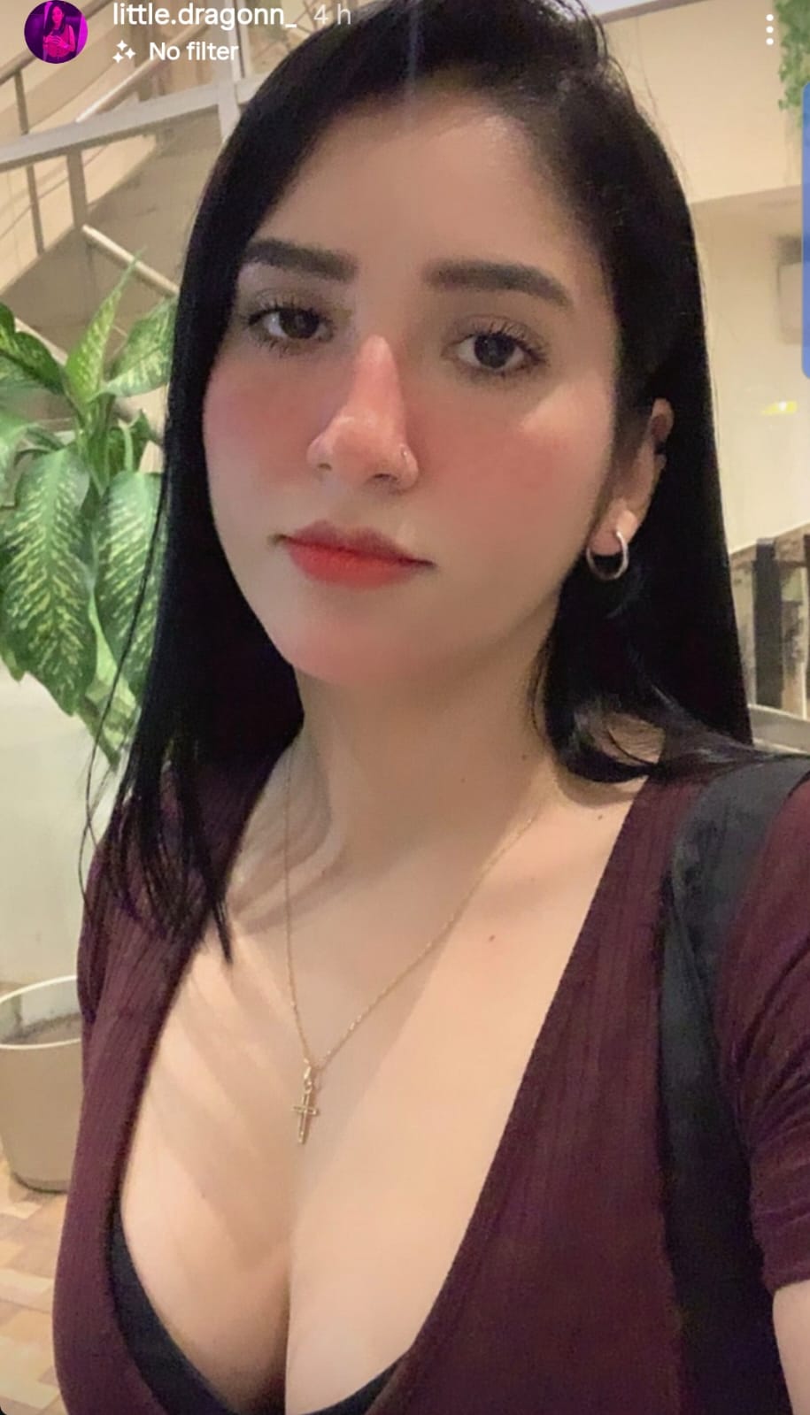 Wizards, please have her lower the top half of her dress to reveal her breasts while still holding her phone with her left hand.