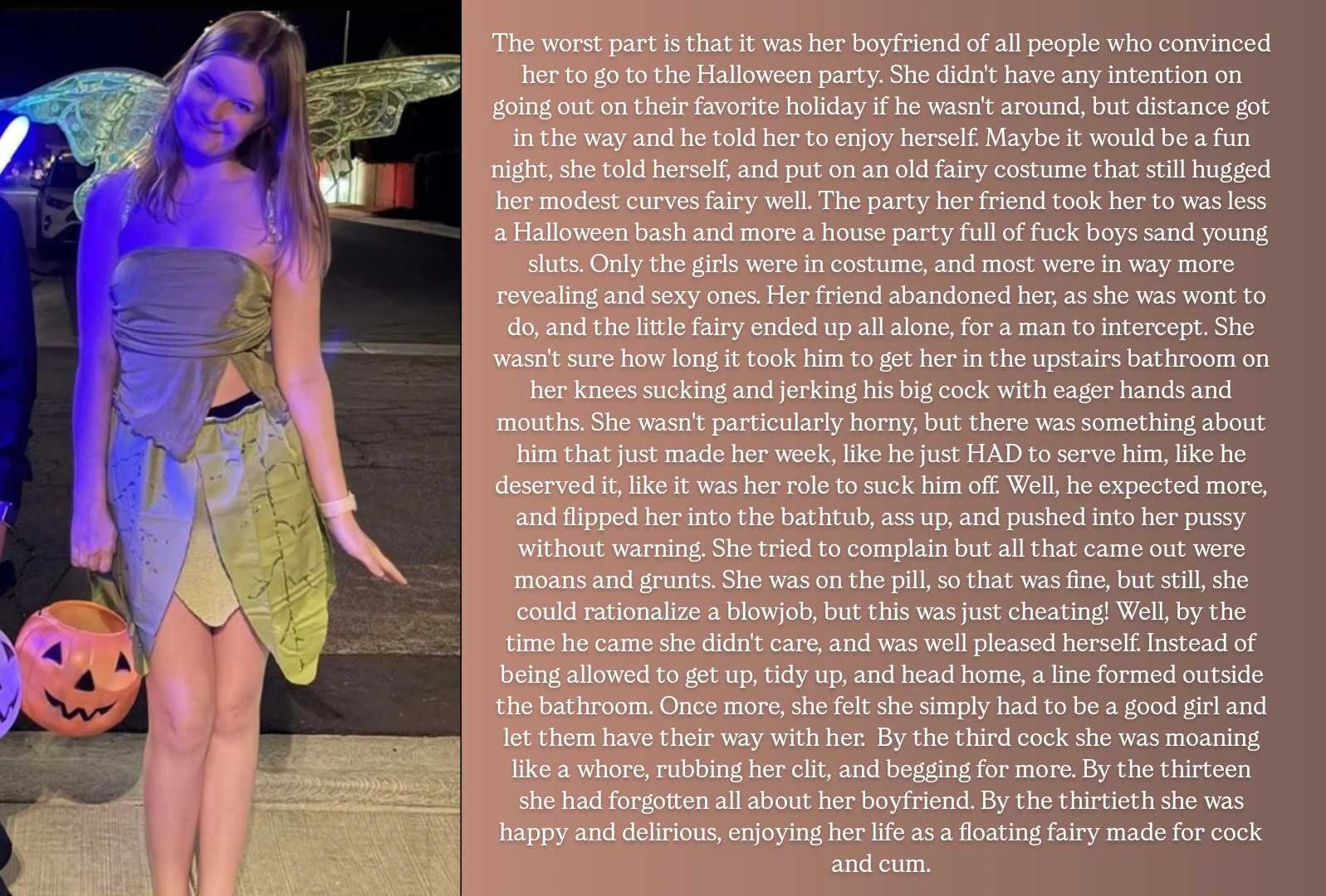 Plot: reluctant girl in a fairy costume goes to a halloween party gets convinced to fuck (either singular dude or gang bang) and shows her slutty side