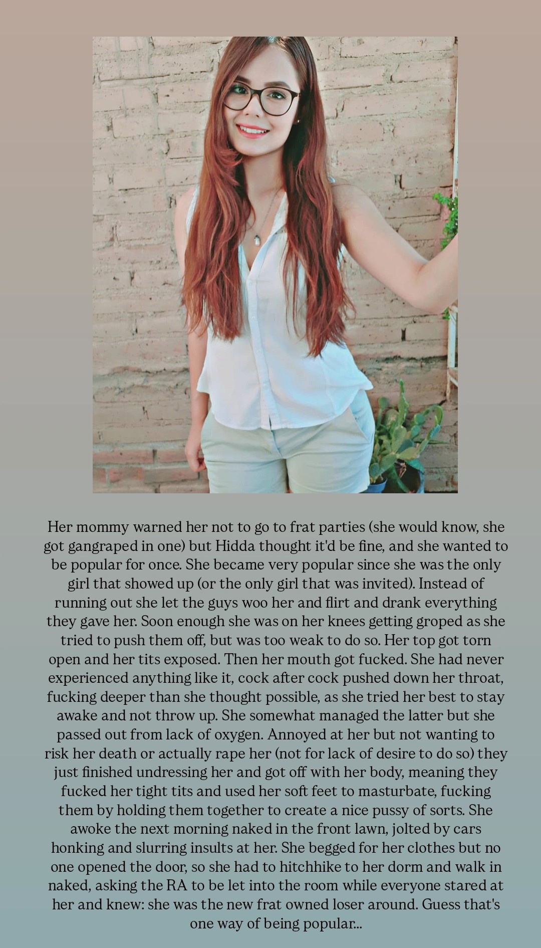 Kink: non-consensual sex with her best friend's bf (Anna's bf), deep fuck, big dick. At first she is forced but eventually gives in.