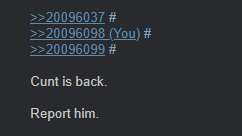 >>20096037>>20096098>>20096099Cunt is back.Report him.