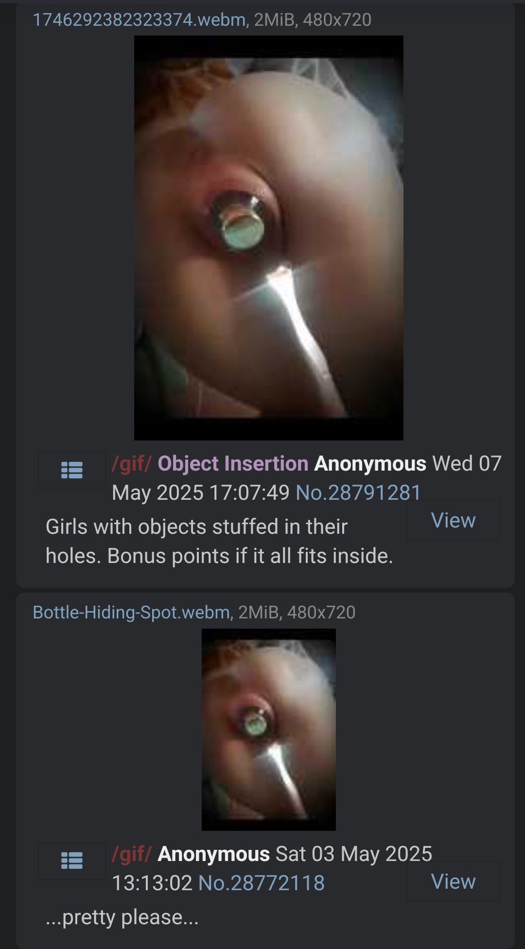 lovely gif board has 'major insertion' threads from time to time, please upload 2 videos I have been looking for:Pic related, and one where the girl is bent over and pushes out a moisturizer bottle.