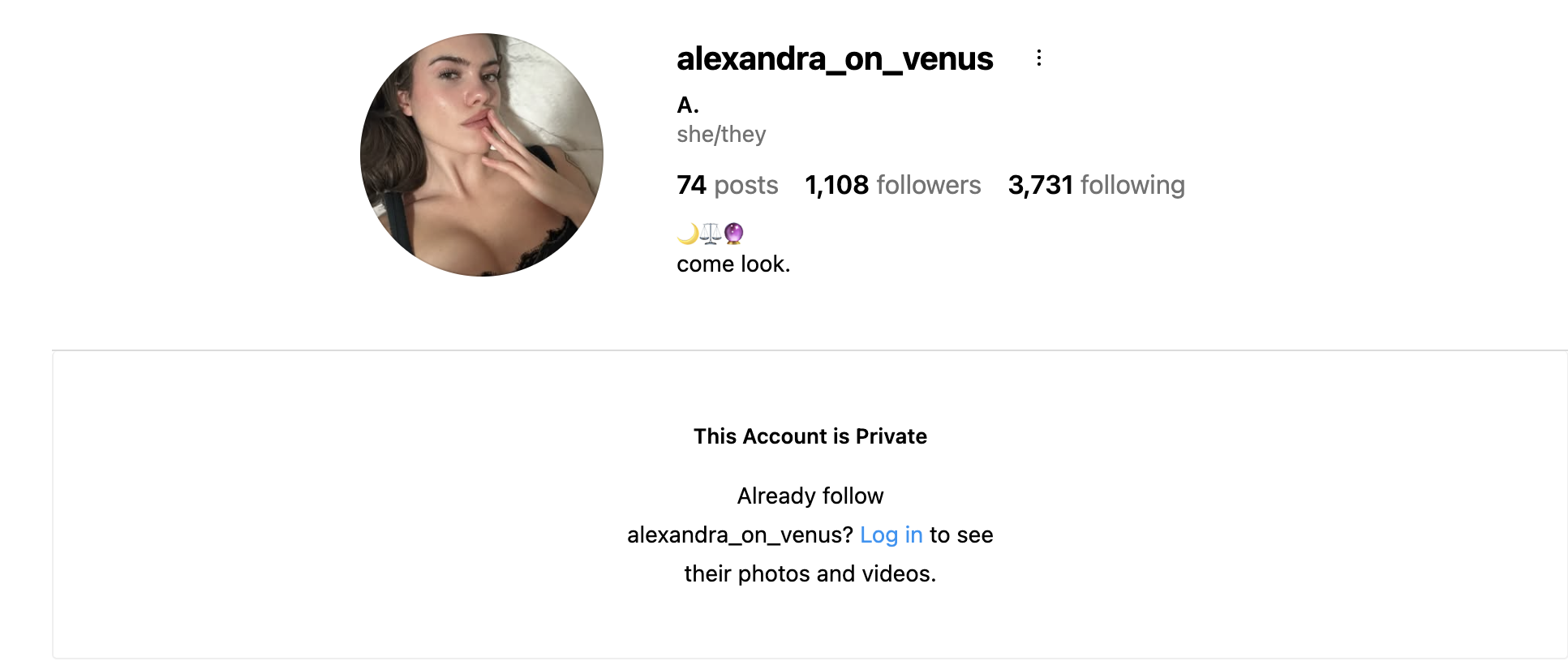 The account's tag is @alexandra_on_venus .I want to look at the posted photos but the account is private.If anyone here knows a way around that, could you post the first six photos.