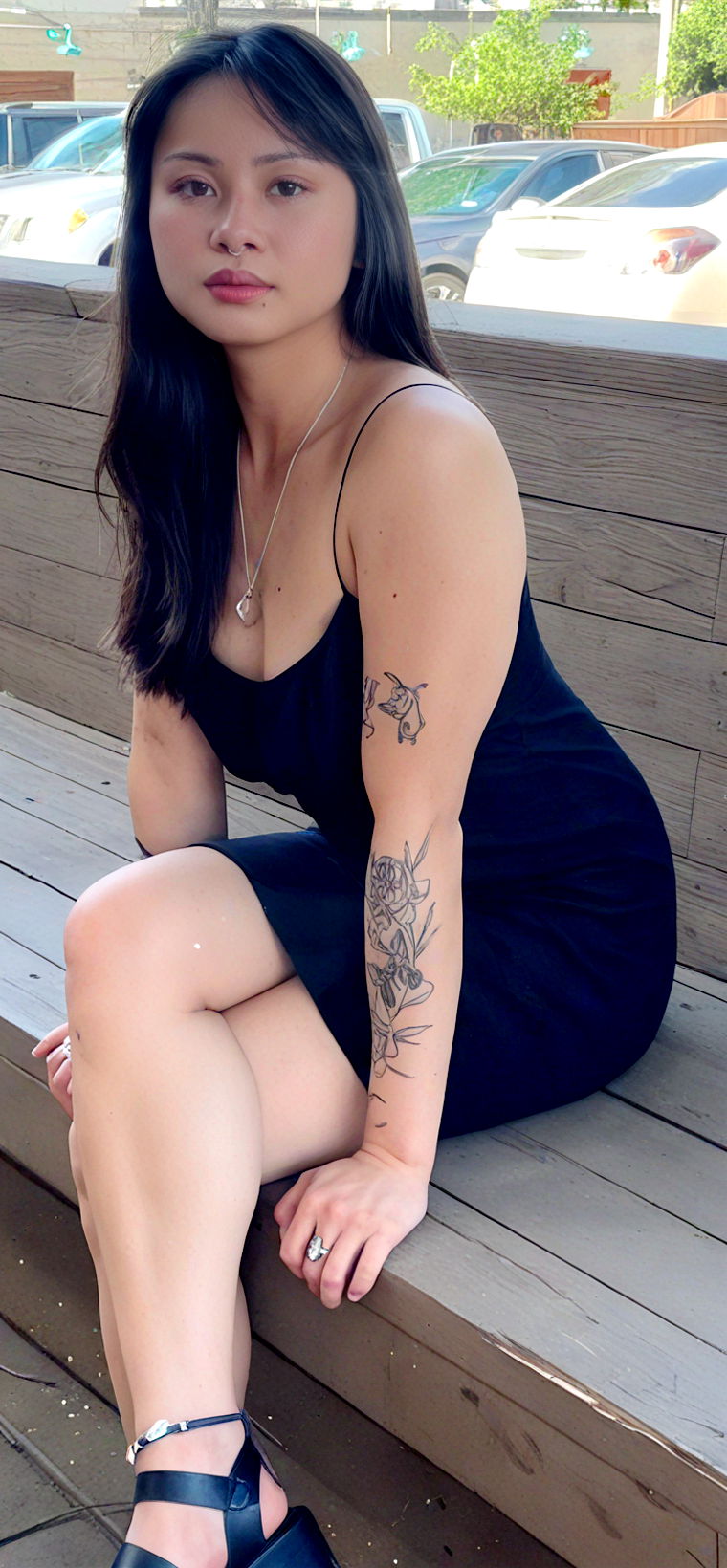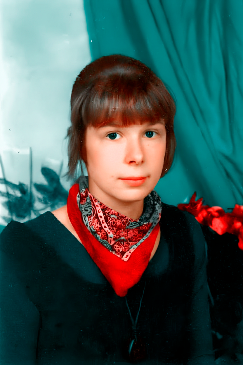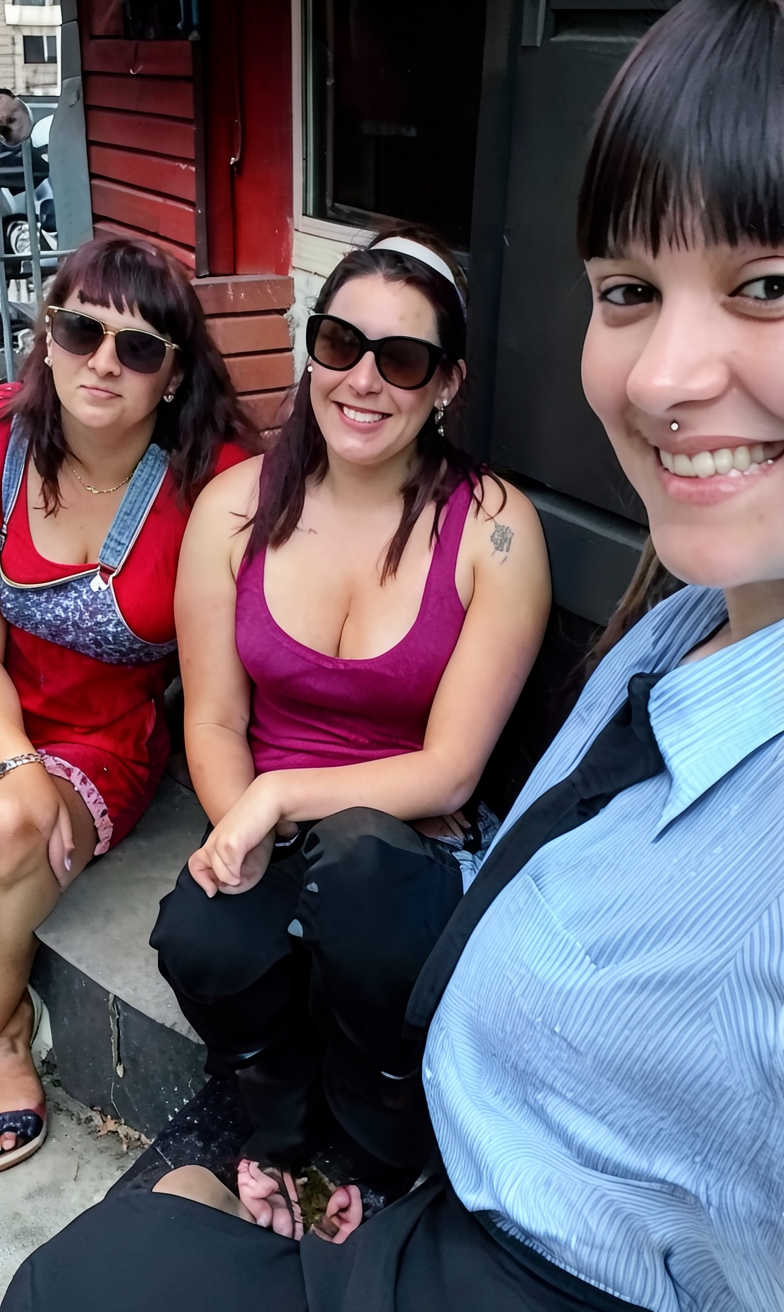 upscale would be greatly appreciated! if it's not too much trouble would it be possible to only have the girl in the middle stay in the photo please? and possibly for her to have a neutral facial expression?