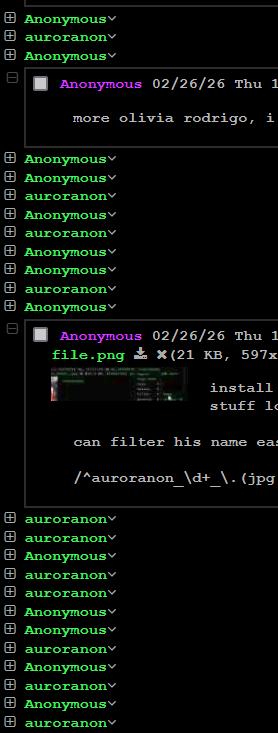 install the 4chan X userscript. lets you filter stuff locally.can filter his name easy and add this to the filename filters/^auroranon_\d+_\.(jpg|jpeg|png|webm|gif|mp4)$/