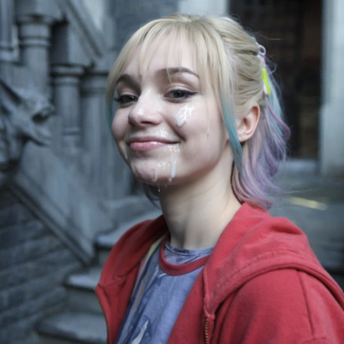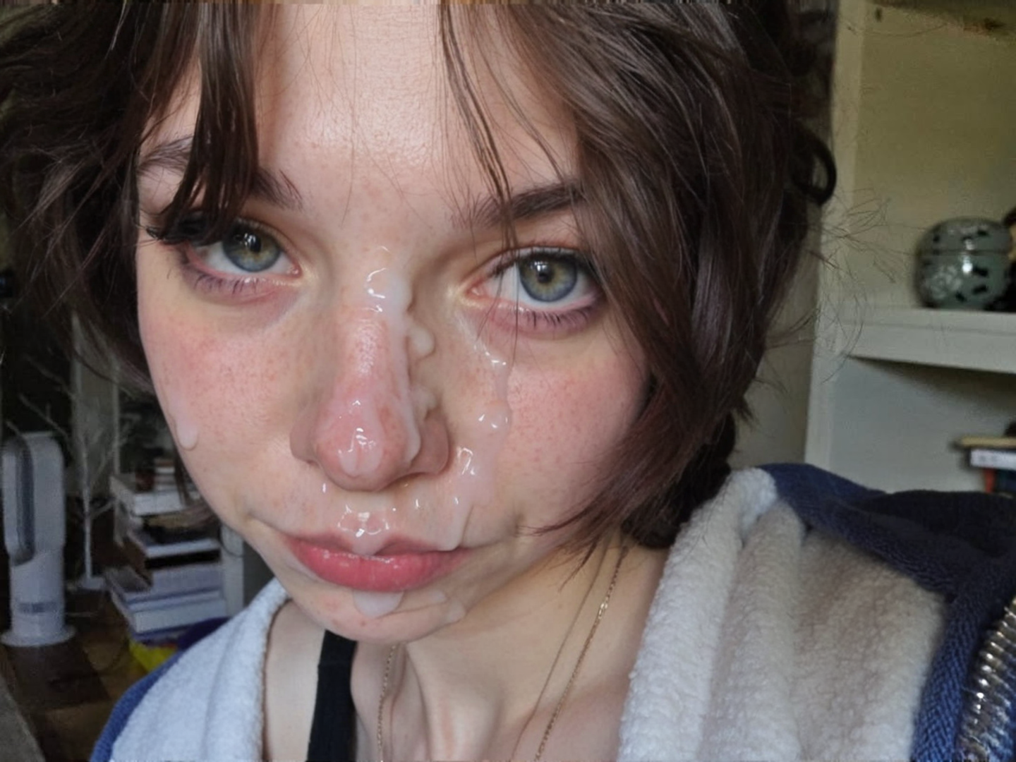 >>20381488Now have her topless and smiling with her tongue out pooling the cum