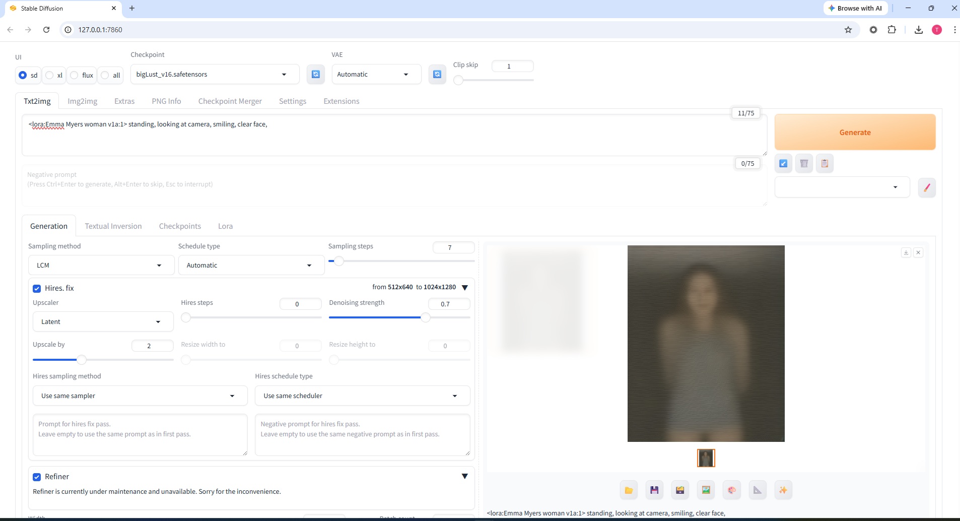 >>20384294The trigger word according to that is just 'emma myers woman' which was already part of the prompt i get when i click on the lora. I still added another 'emma myers woman' and now its distorted. i know im missing something obvious here.>>20384297I am clicking the lora. it adds the prompt <lora:Emma Myers woman v1a:1> when i do....unless im supposed to be doing something else on the lora page?