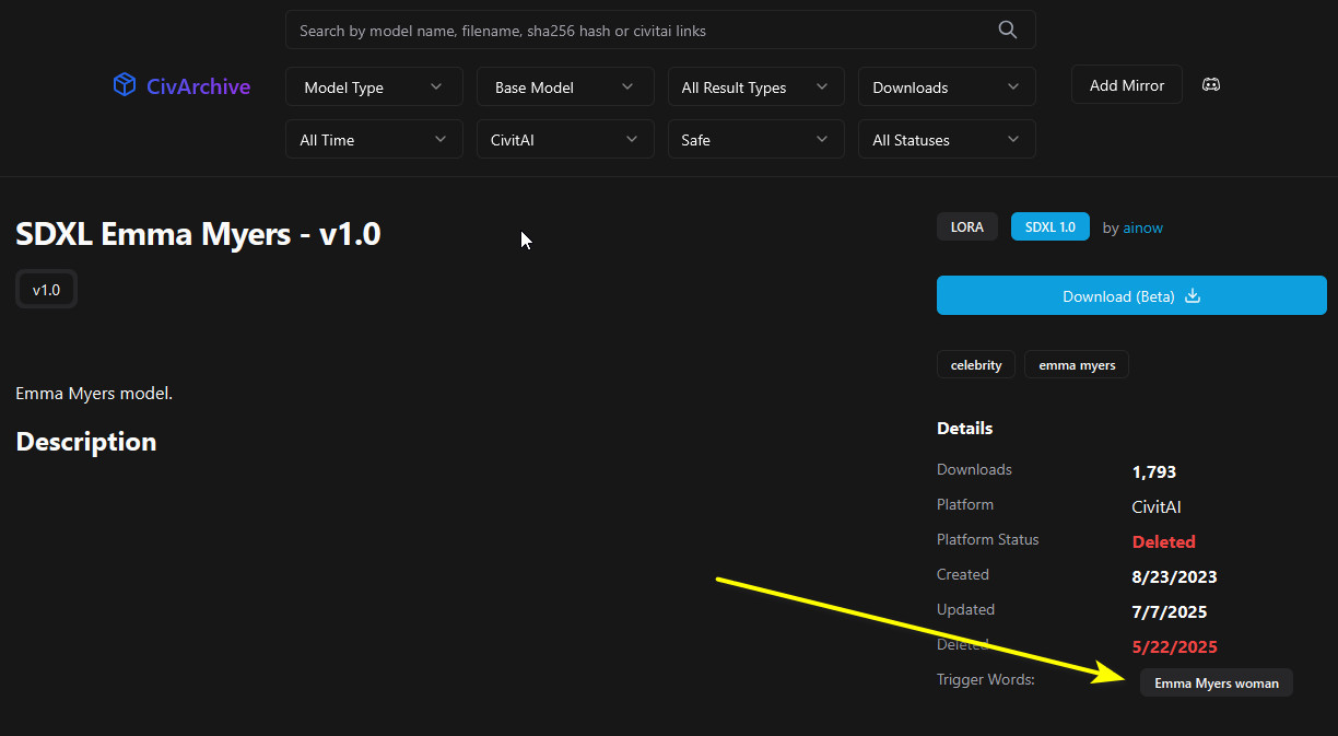>>20384286>trigger words but i didn't see them on the page?you were so close to being on the right page, click 'sdxl emma myers' heading text further down the page and you'll get the model page with more infoyou can also use this page, drag and drop lora file to see what info it showshttps://xypher7.github.io/lora-metadata-viewer/