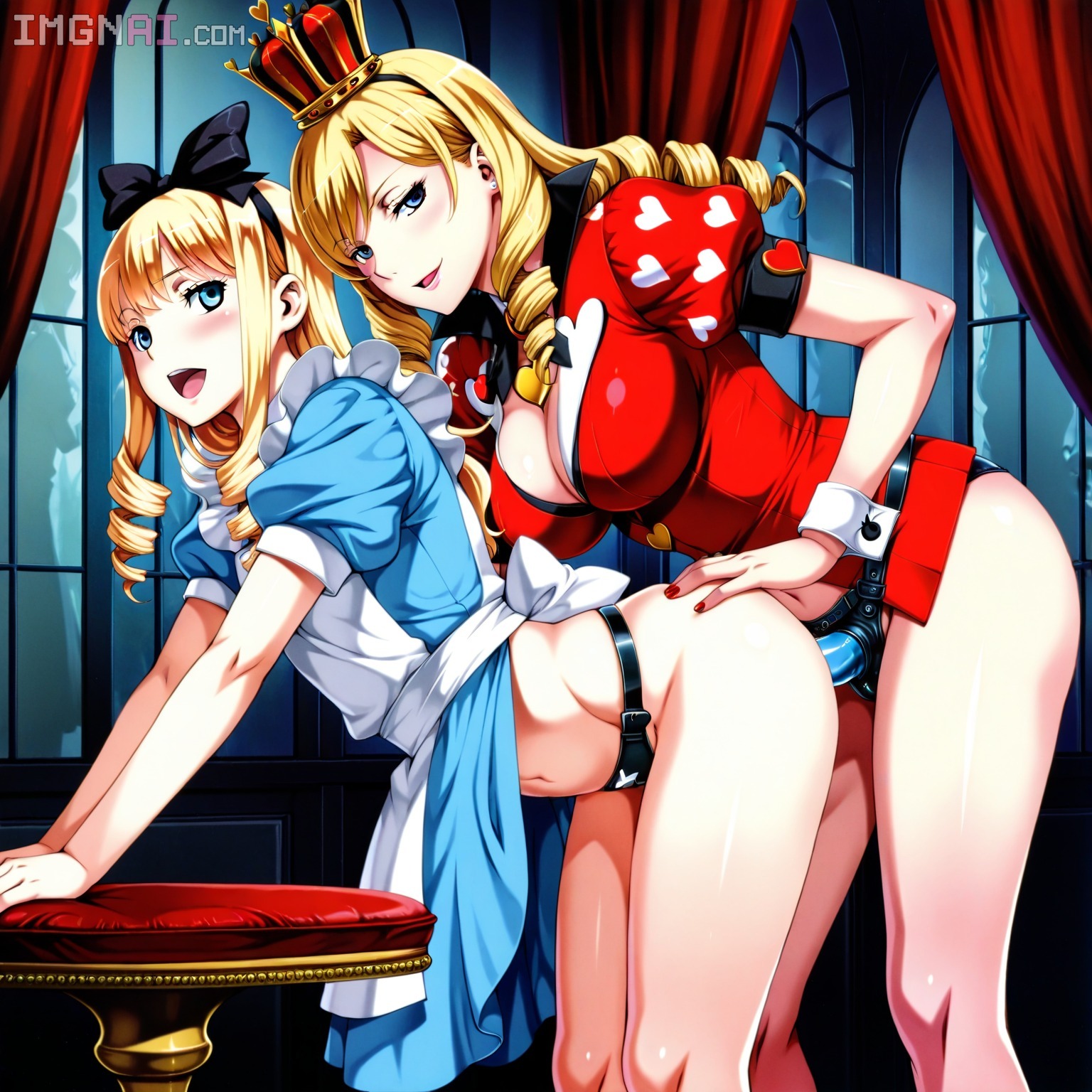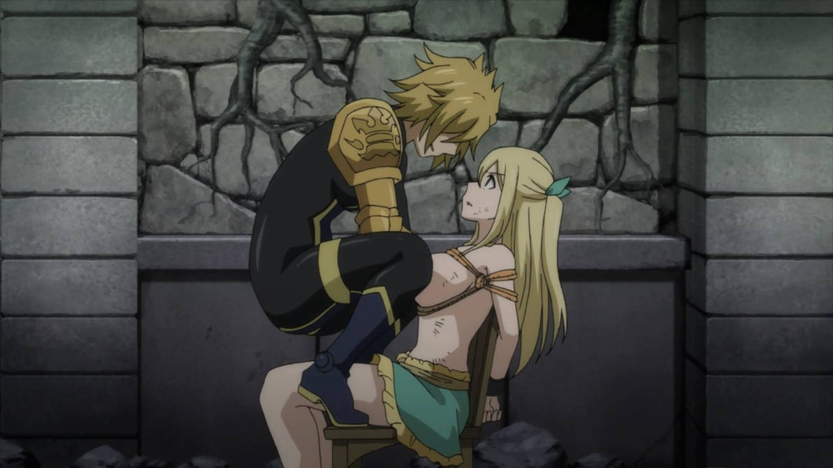 Hope this is doable. An actual anime screencap, of Lucy captured by Dimaria. Can you have the black suited girl squatting above Lucy grope and play with Lucy's boobs? Thanks.