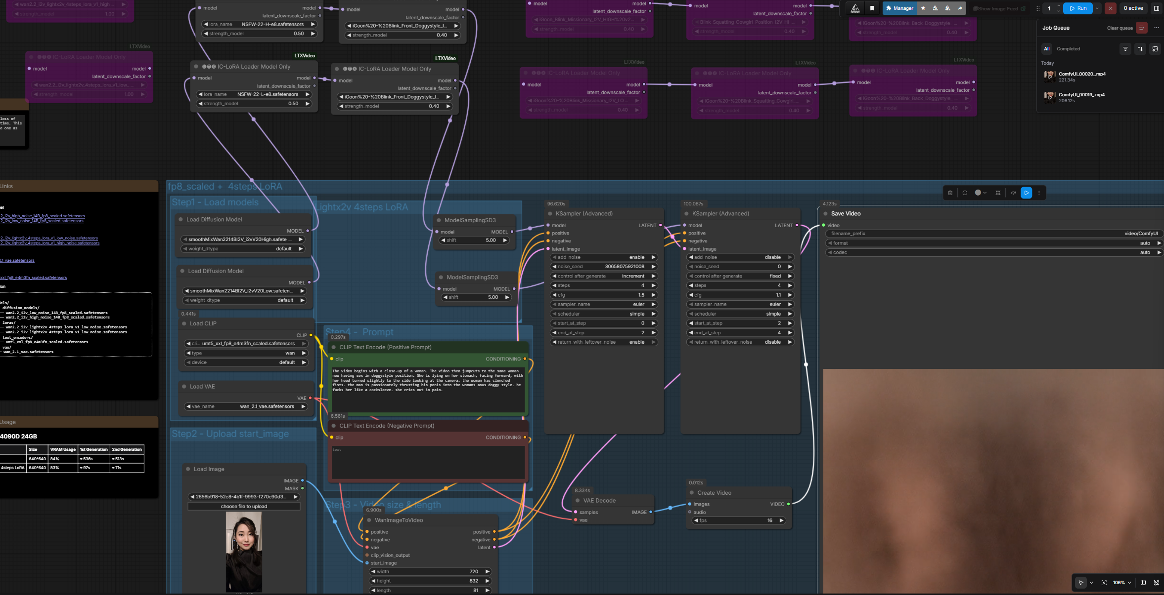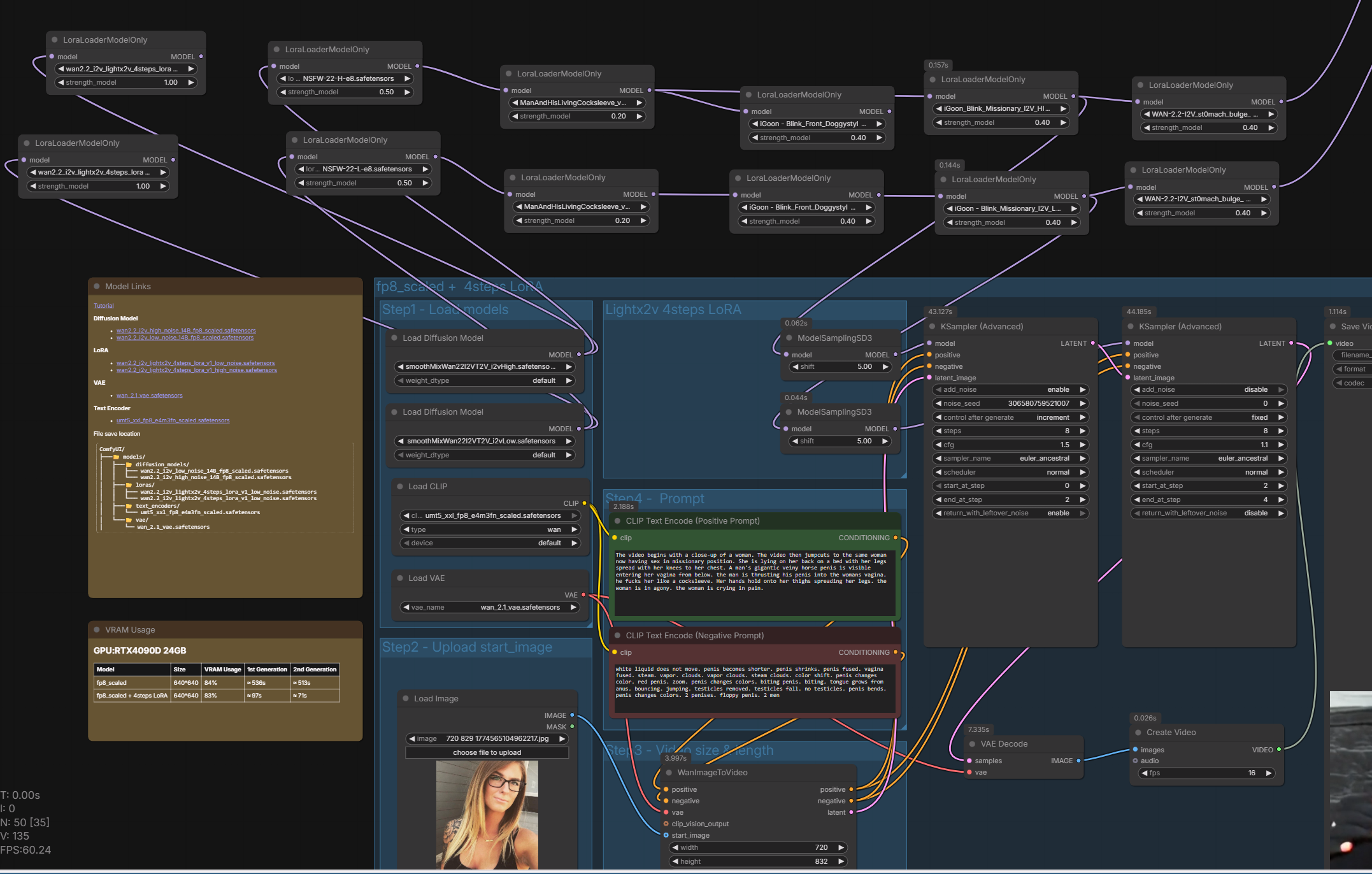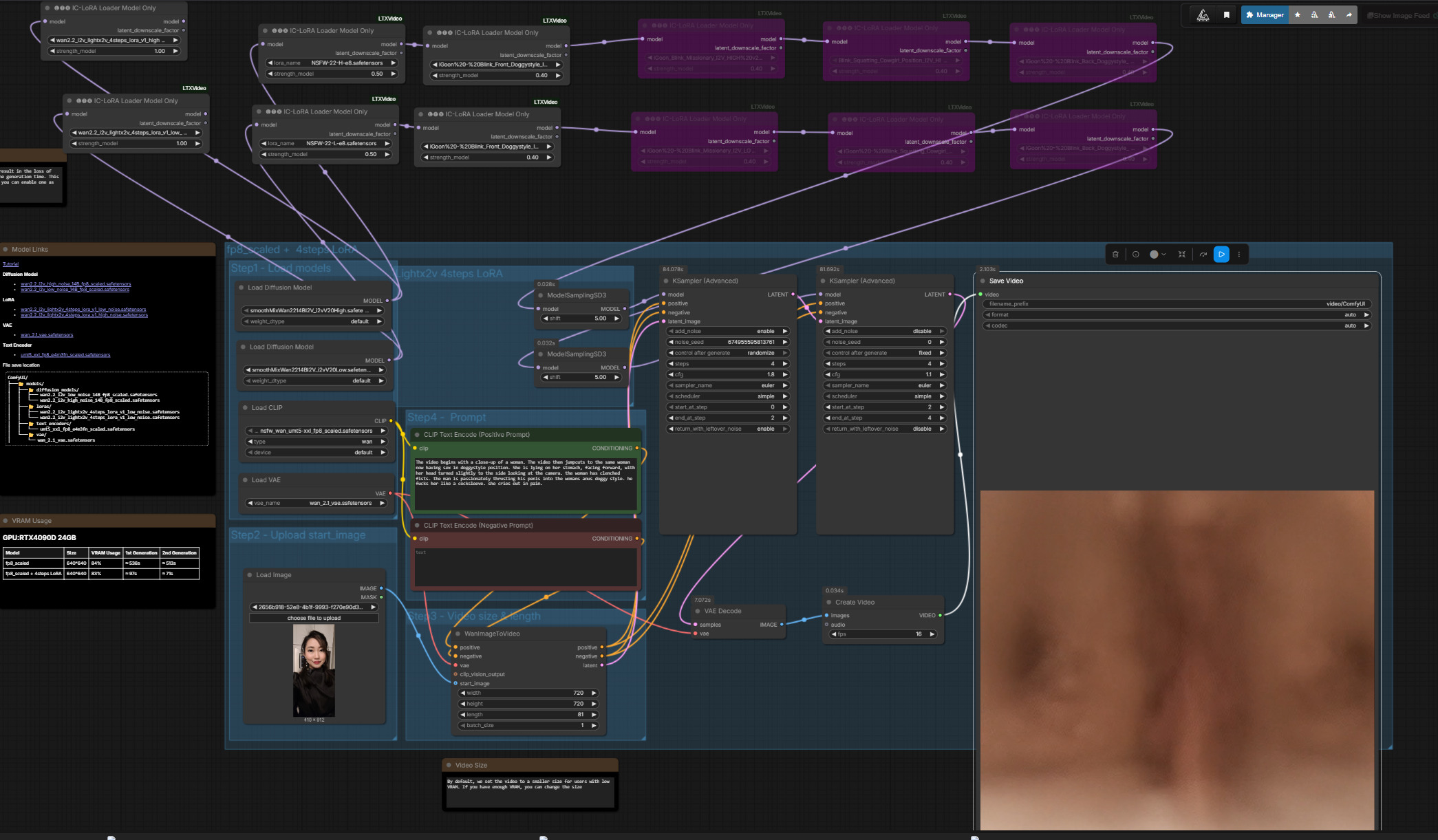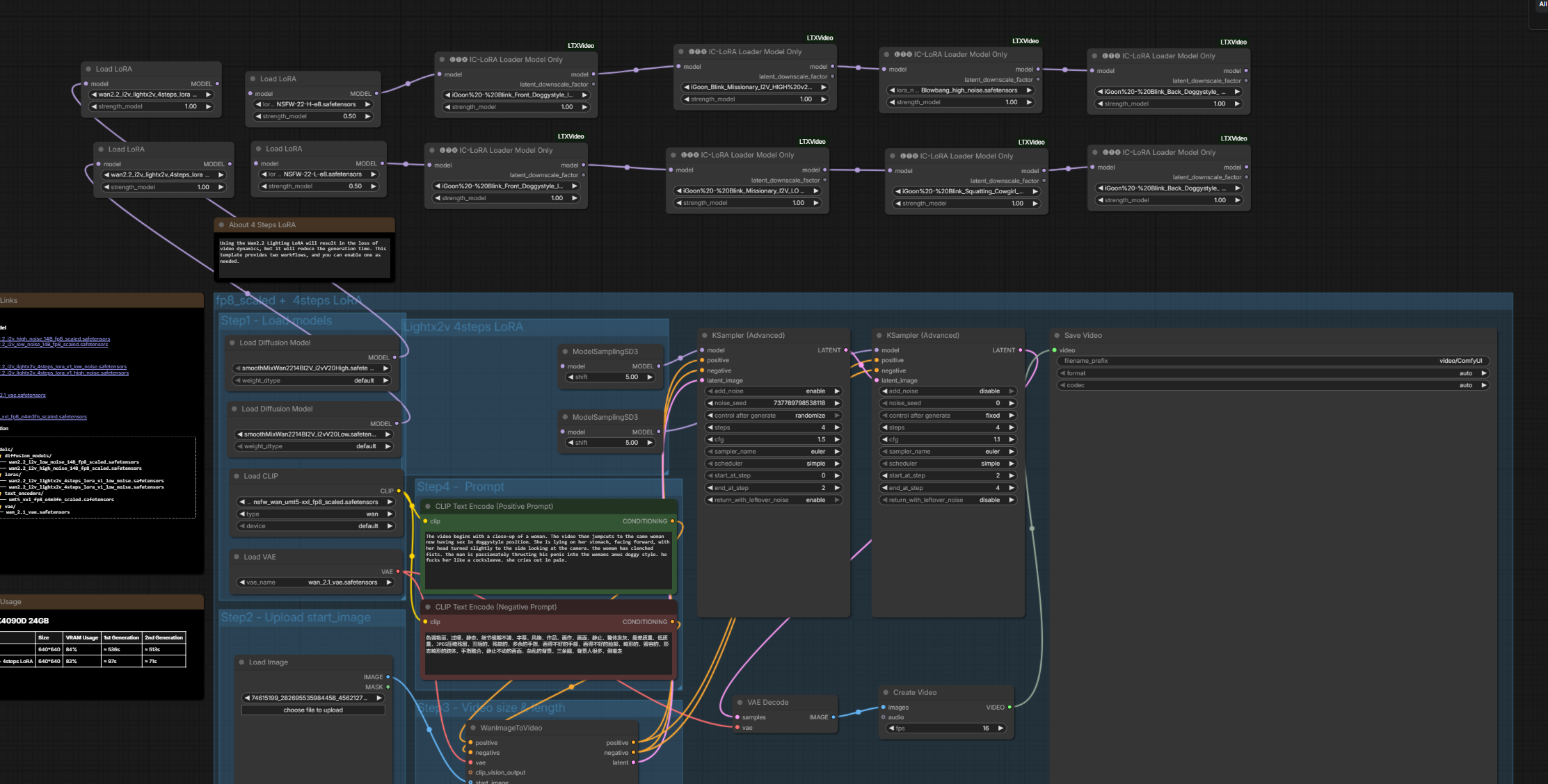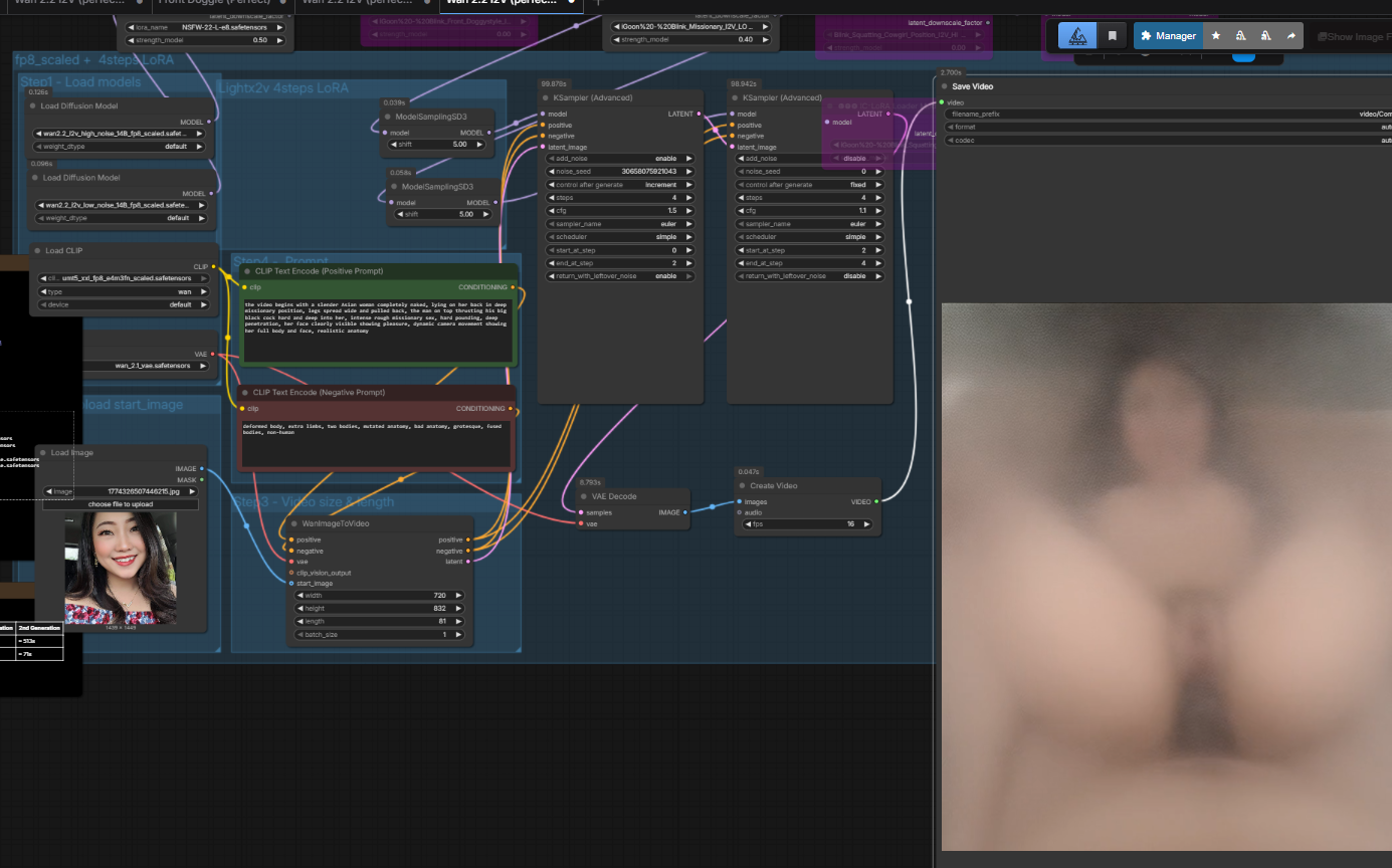 >>20416687The workflow is barebone super basic. Wan 2.2 i2v template with below nodes/loras:SmoothMix - base modellorasNSFW 0.5igoon Blink-Front Doggy 0.4KSamplercfg 1.5 hicfg 1.1 lo