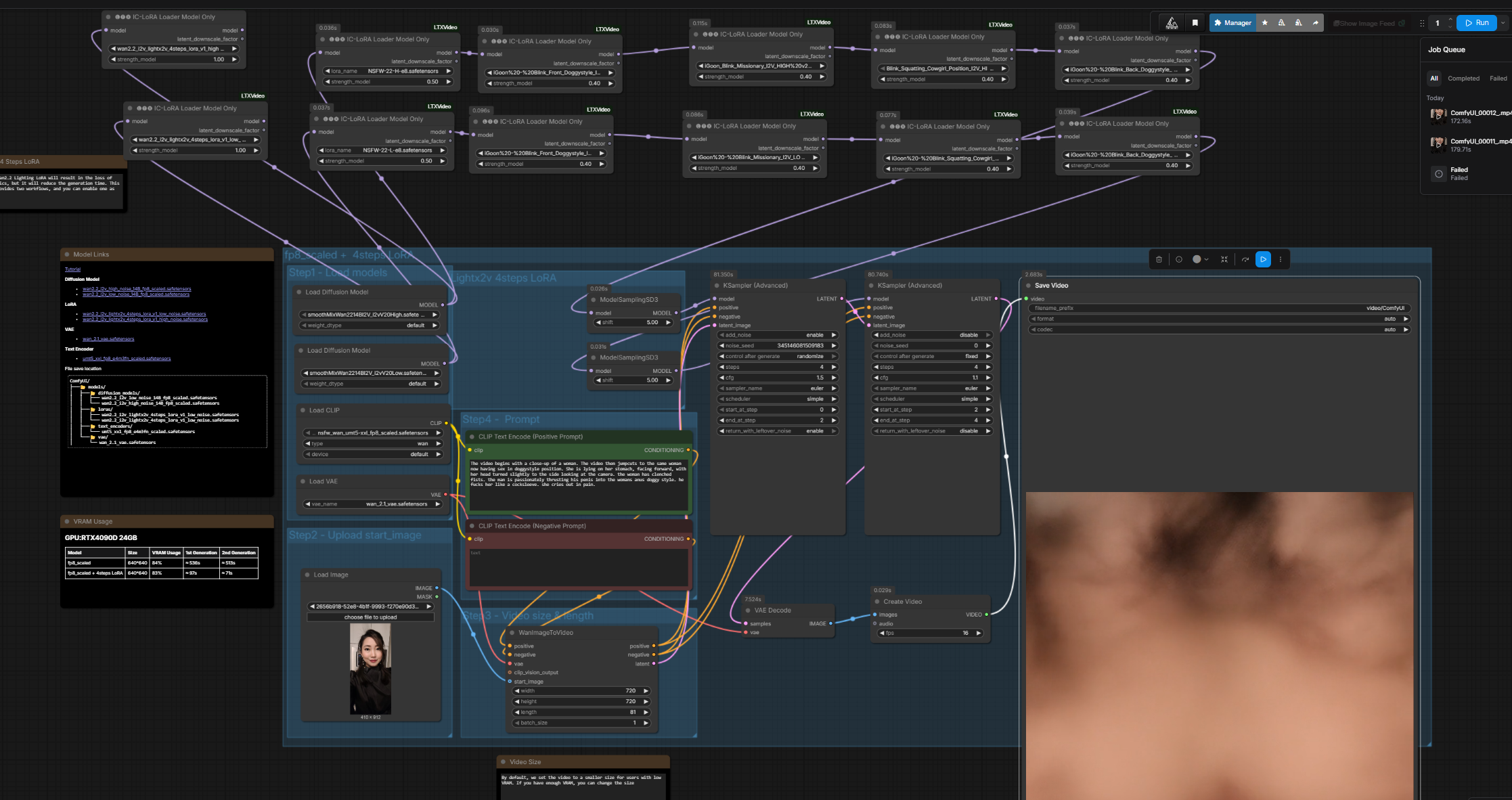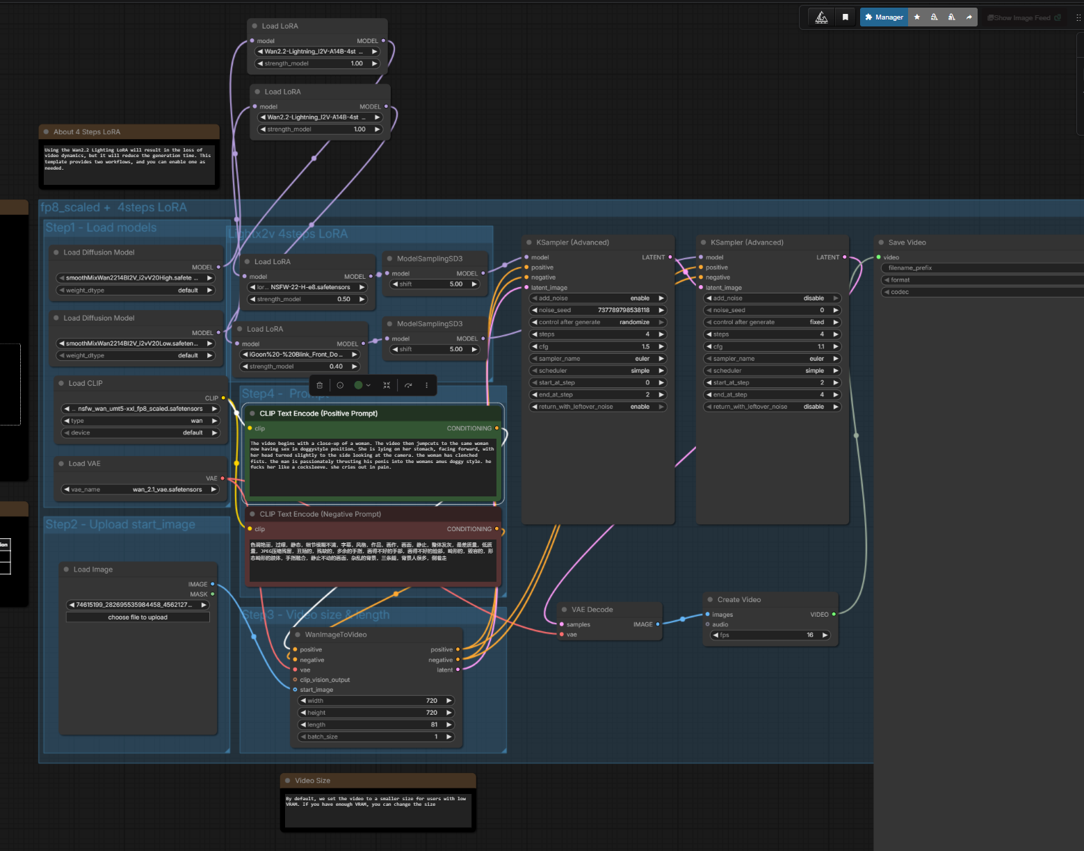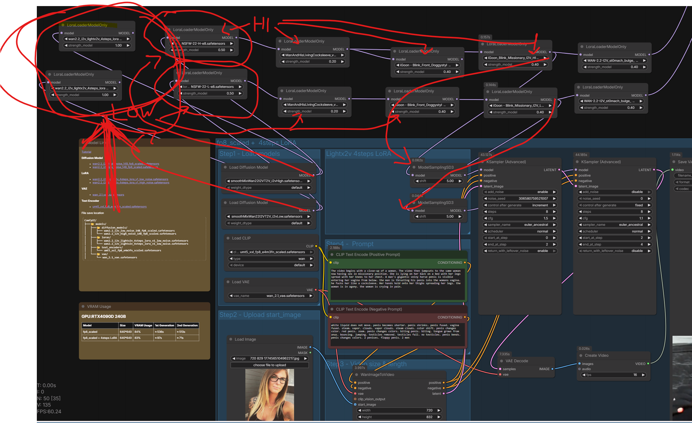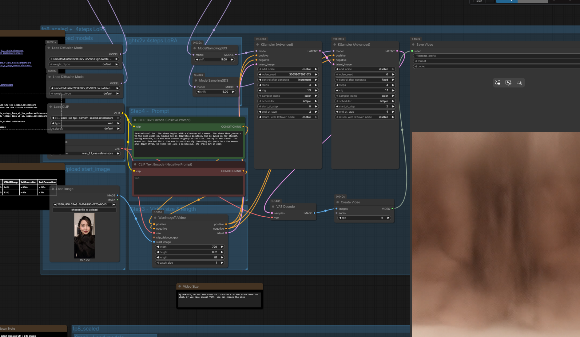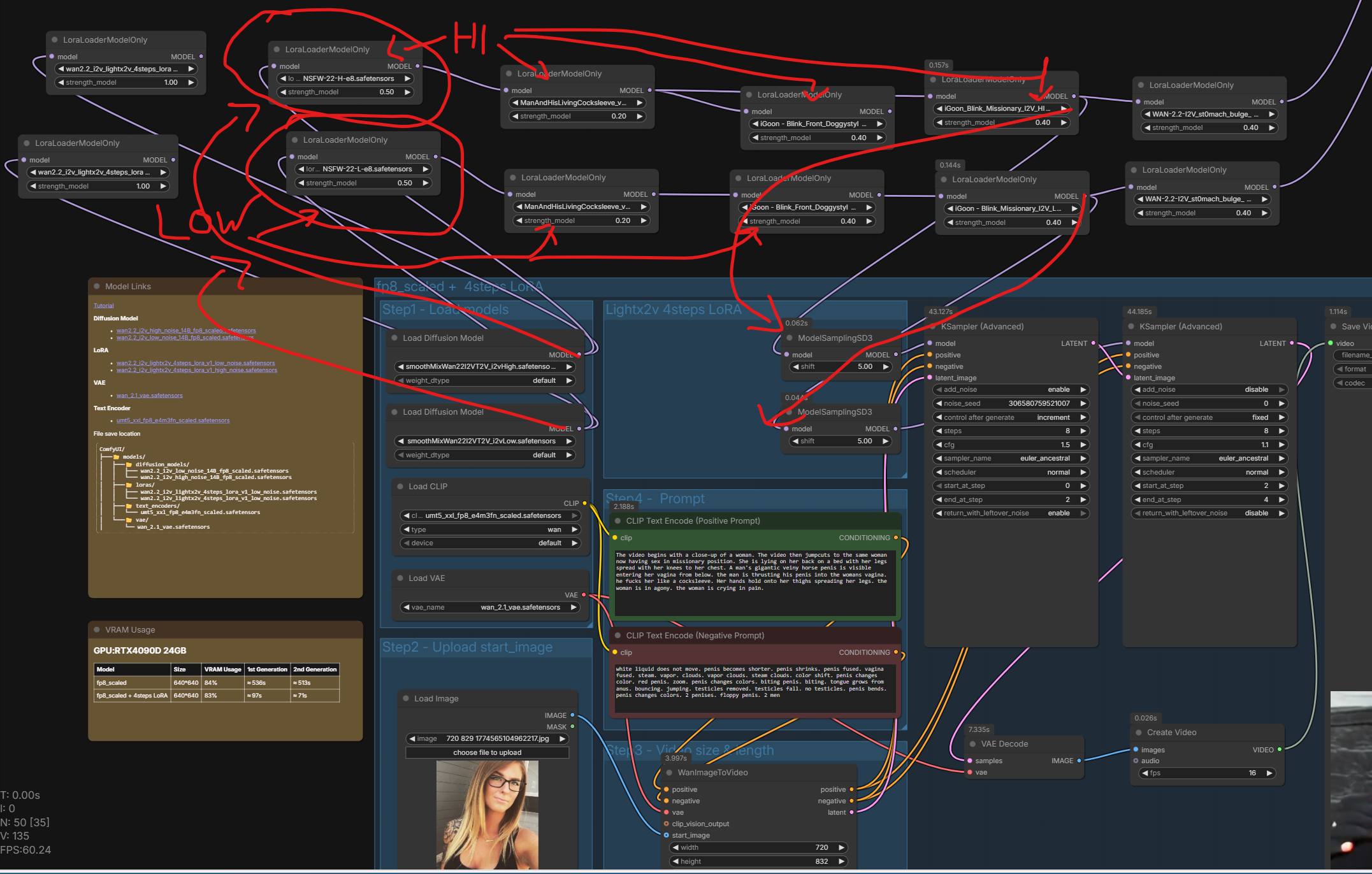 >>20416687The workflow is barebone super basic. Wan 2.2 i2v template with below nodes/loras:SmoothMix - base modellorasNSFW 0.5igoon Blink-Front Doggy 0.4KSamplercfg 1.5 hicfg 1.1 lo