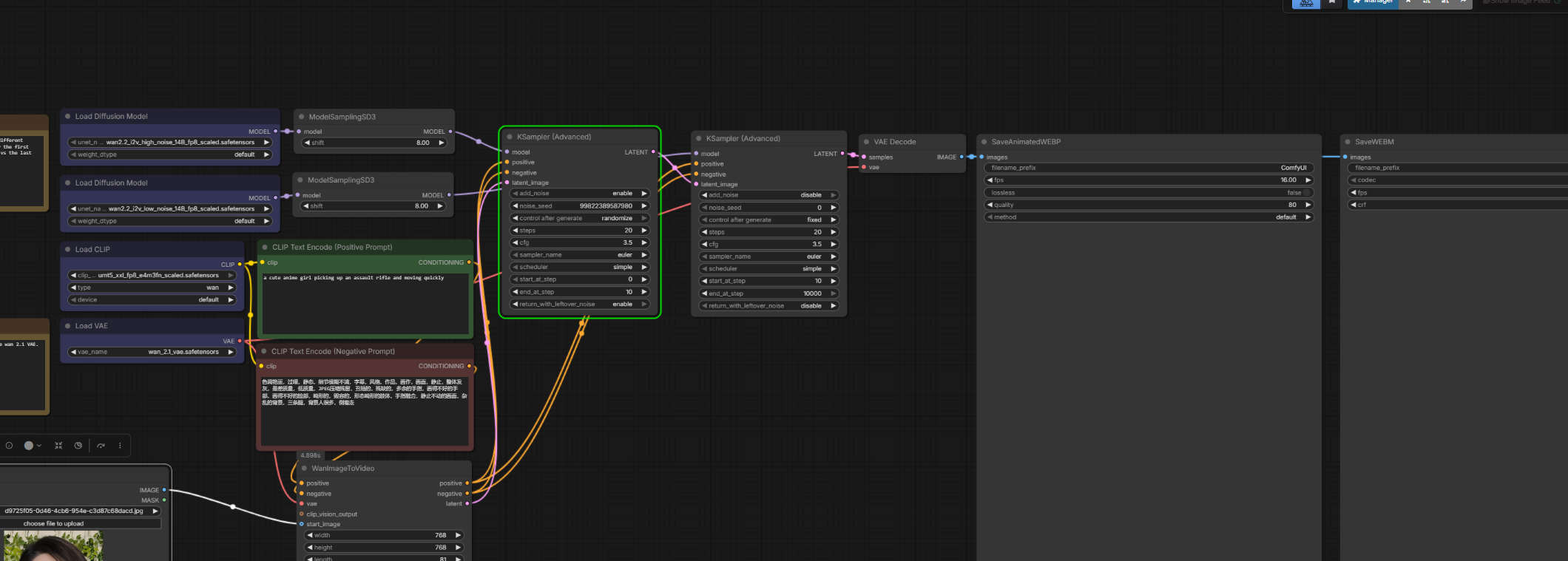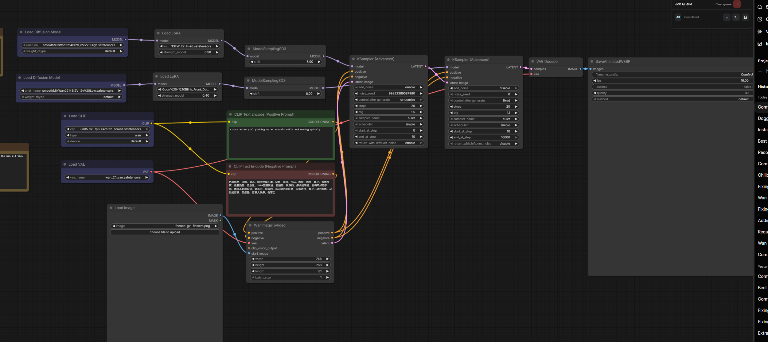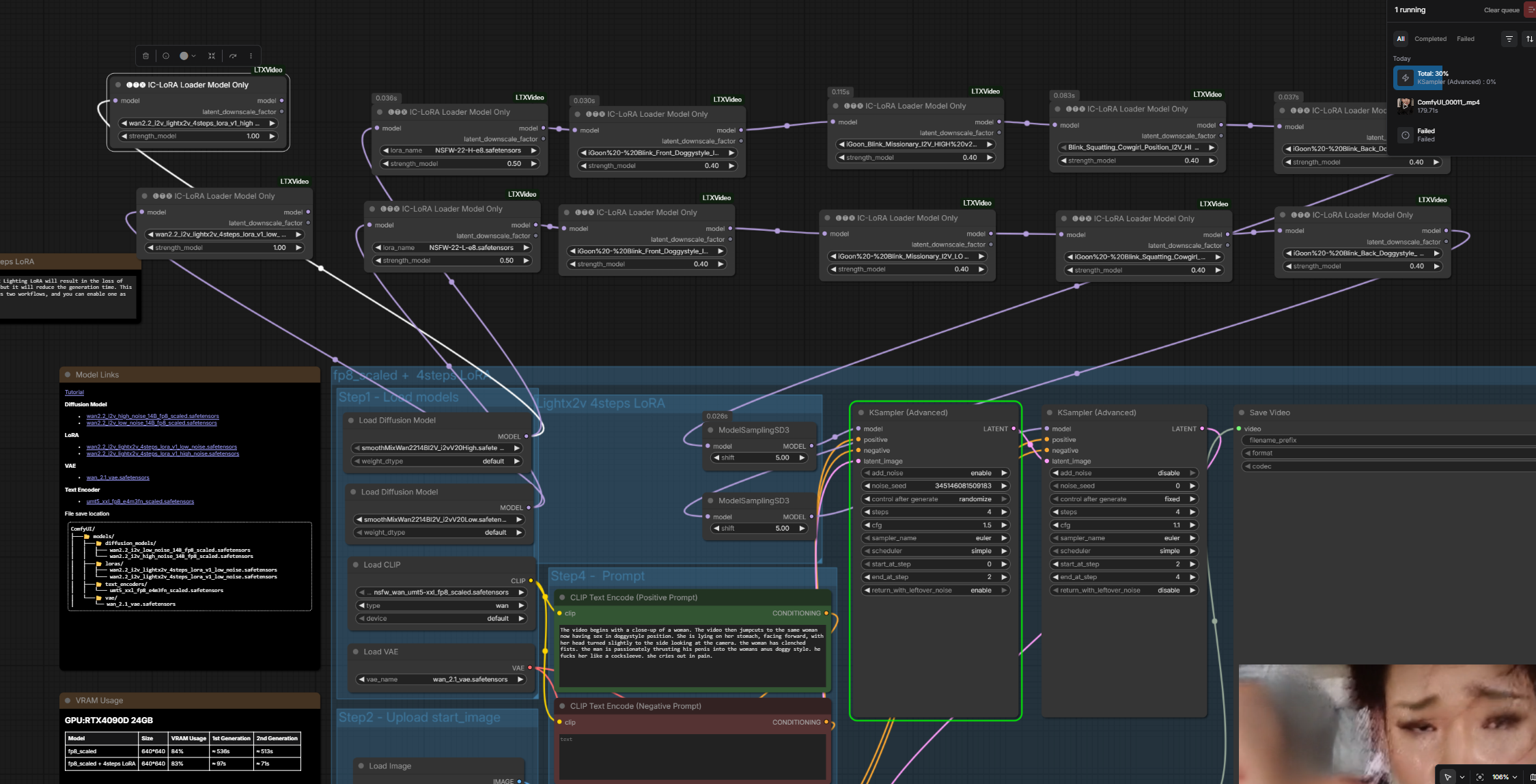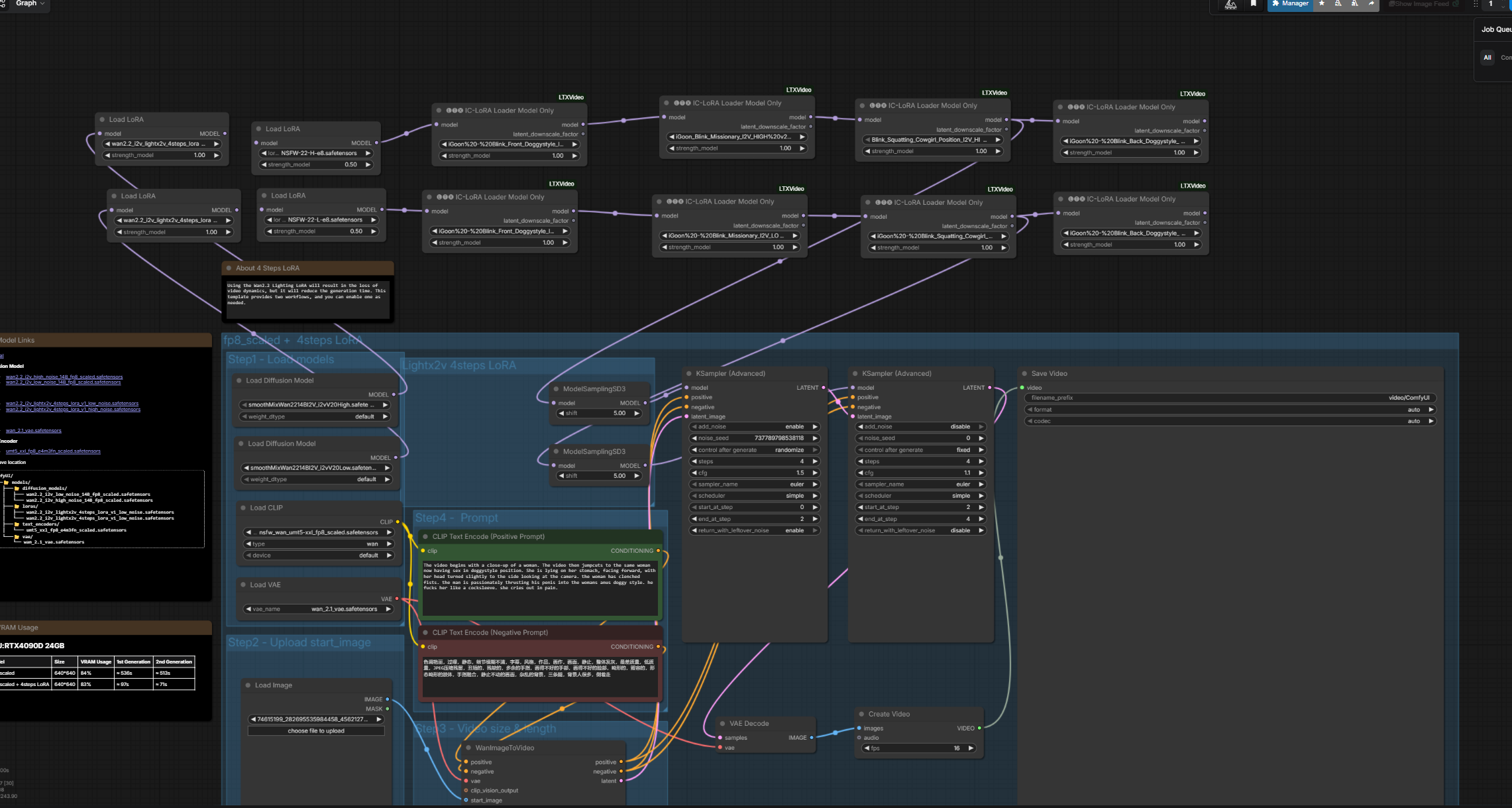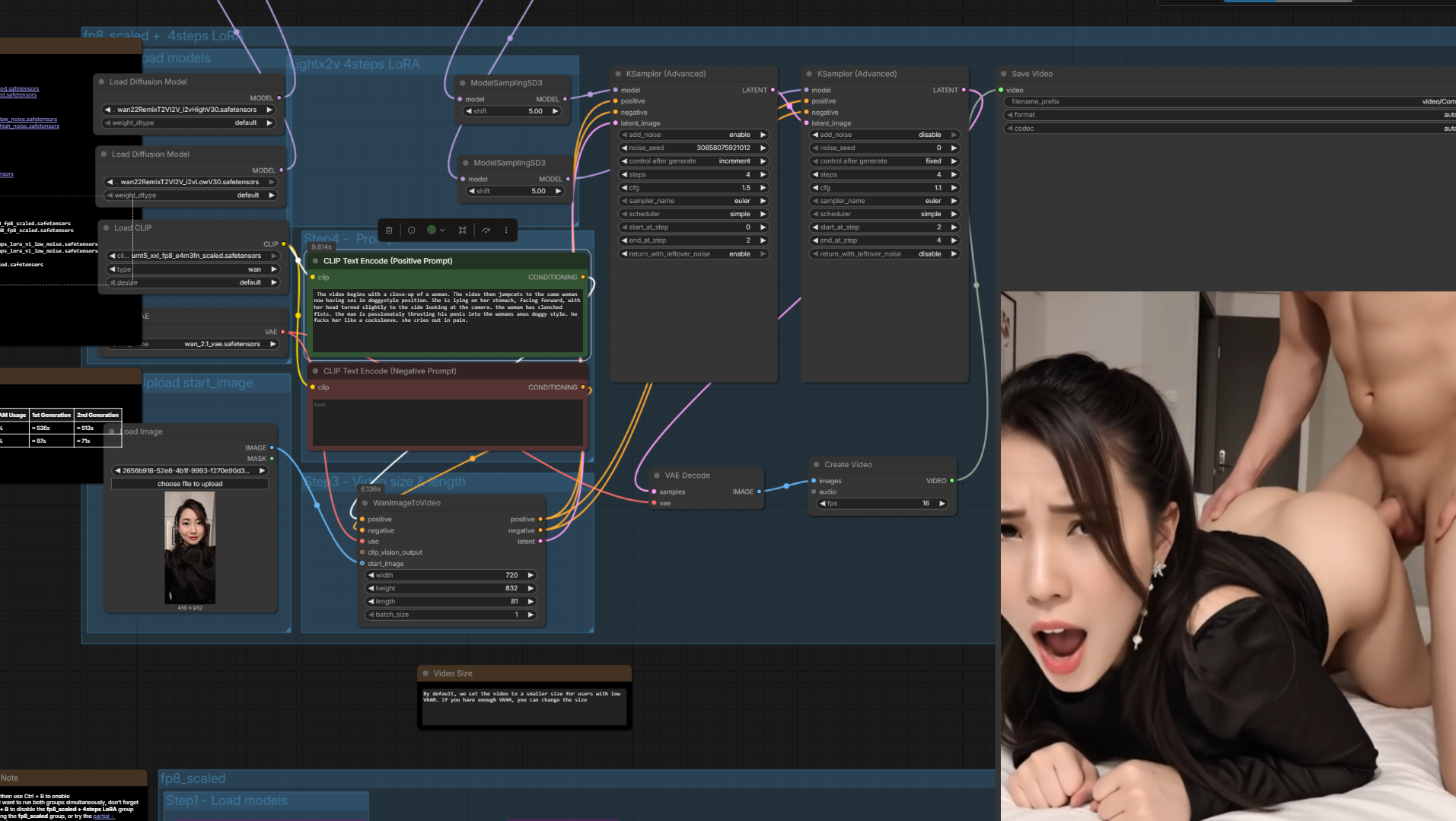 >>20416687The workflow is barebone super basic. Wan 2.2 i2v template with below nodes/loras:SmoothMix - base modellorasNSFW 0.5igoon Blink-Front Doggy 0.4KSamplercfg 1.5 hicfg 1.1 lo