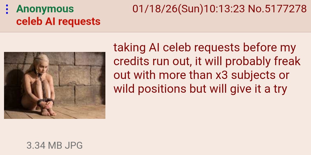 >>>Guides<<<figure it out lil bruises. due to mass trolling, bakes including links to anything other than generators are automatically ryan bakes.>>>Proprietary generators<<<Grok:https://x.com/i/grok/Meta AI:https://www.meta.ai/Reve:https://preview.reve.art/appImageFX:https://labs.google/fx/tools/image-fx>>>Archive<<<https://thebarchive.com/b/search/subject/Realistic/https://archiveofsins.com/r/search/subject/Realistic/https://archived.moe/r/search/subject/realistic/>>>Z-image Turbo celeb loras<<<https://huggingface.co/malcolmrey/zimage/tree/main>>>Share anon's archive<<<Original:https://gofile.io/d/BhUUAU12 Loras:https://gofile.io/d/ivgCRm>>>Professor Penguin WAN 2.2 loras<<<https://huggingface.co/profpeng/models>>>Tip for requesting, if there are not loras try to gather some images, lets say about 50, but more is even better, clean face, no glasses or shit blocking the face, several angles and please good light. Zip them and share gofile, some Genanon might like the girl/concept/request and train a lora to gen.<<<Previous >>20415123