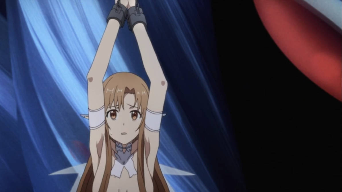 Last one. Please animate the image panning downwards showing Asuna's tits and the villain Oberon approaches her to grope and play her tits. Thank you.