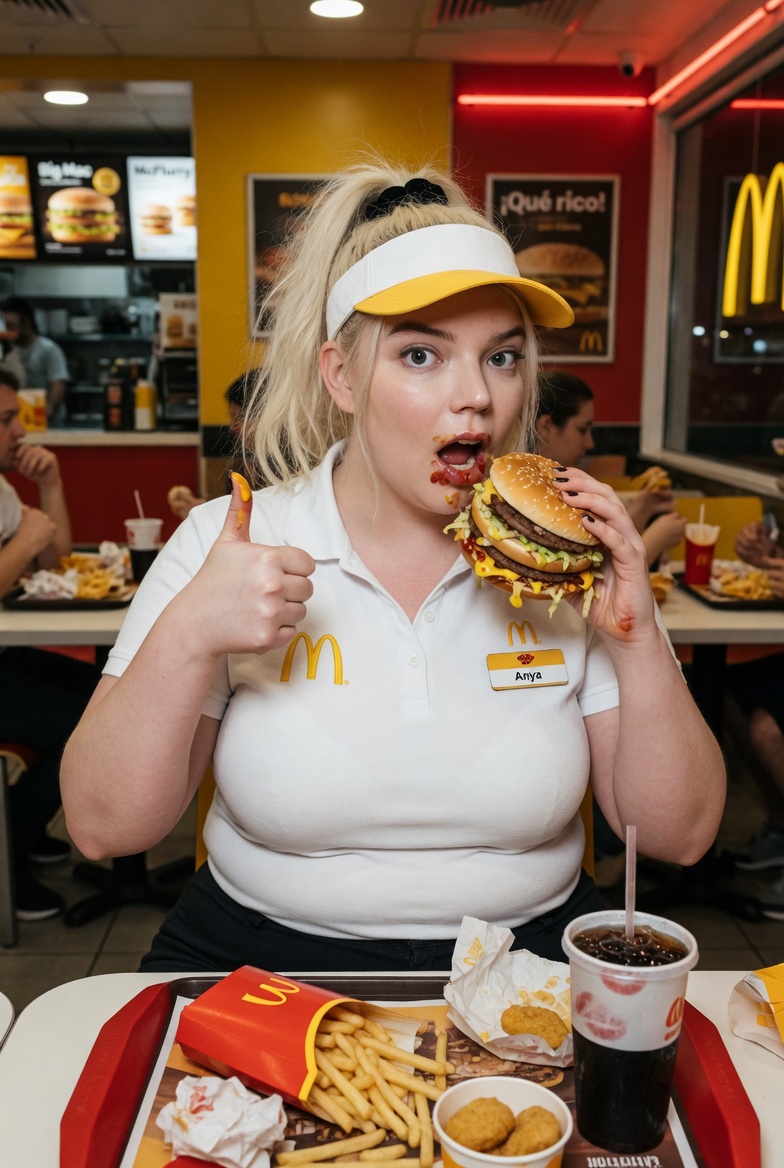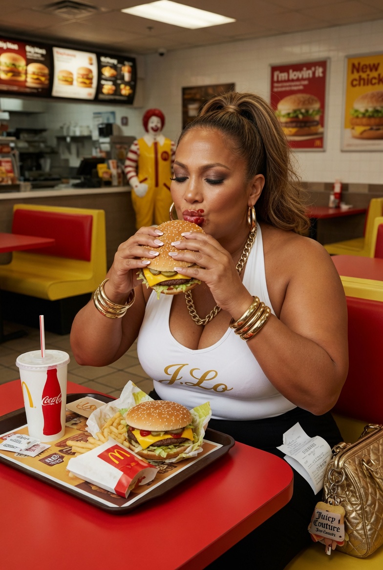Can someone create an image of a celeb but overweighted and eating at McDonald’s? Whatever celebrity is good