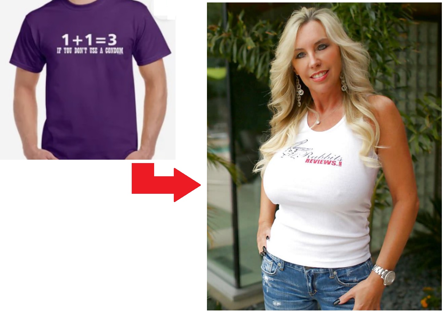 Can wizard put the `1+1=3 caption on the blonde's tshirt and upscale her so she is not so blurry, pls.