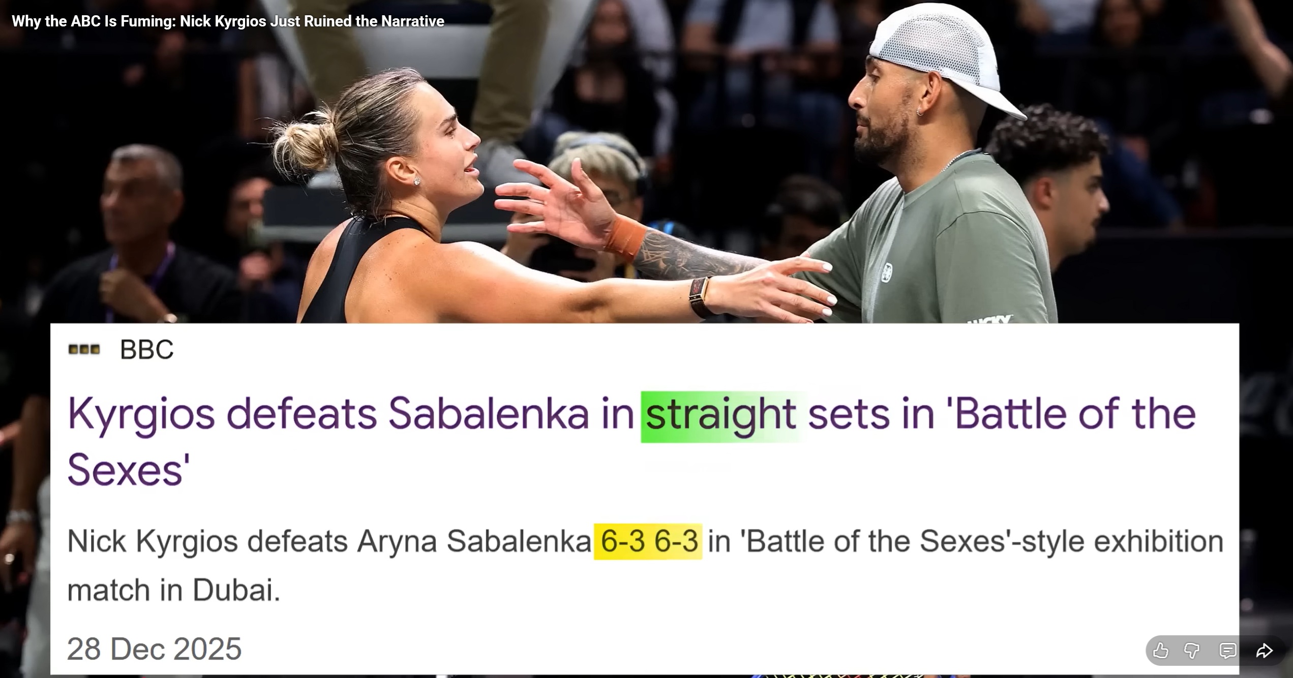 OMFG 6-3, 6-3 STRAIGHT SETS!!! AHAHAHAHAHHAImagine being the female world number 1 and you lose to a Male 30yo has been whos ranked 673rd! HAHAHAHAMedia Cope:>What did Sabalenka and Kyrgios' Battle of the Sexes achieve?https://www.bbc.com/sport/tennis/articles/cqlkqxnvdweo>This 'Battle of the Sexes' was completely unwatchable - we do not need it againhttps://www.independent.co.uk/sport/tennis/kyrgios-sabalenka-battle-of-the-sexes-result-b2891214.htmlYou get it now sluts? Youre not as good or as strong as us. Youre not even as good as low tier male when you're ate your peak. Now shut the fuck up and get back in the kitchen.