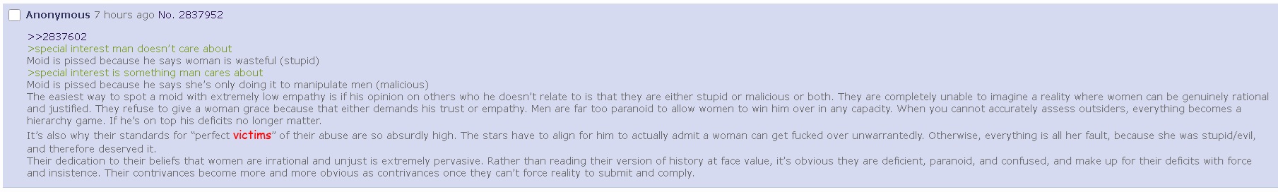 >The easiest way to spot a moid with extremely low empathy is if his opinion on others who he doesn't relate to is that they are either stupid or malicious or both. They are completely unable to imagine a reality where women can be genuinely rational and justified. They refuse to give a woman grace because that either demands his trust or empathy.foids GENUINELY expect you to believe things that aren't in your best interests