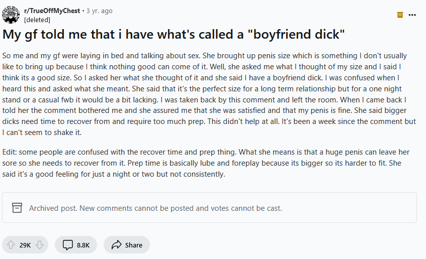 Would you be mad if a woman said you had "boyfriend dick" in this manner?