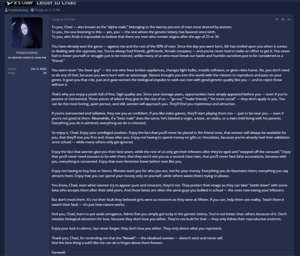 It's funny how literally only redditors and modern 4trannies deny the black pill at this point. Really shows how reddit this site is now