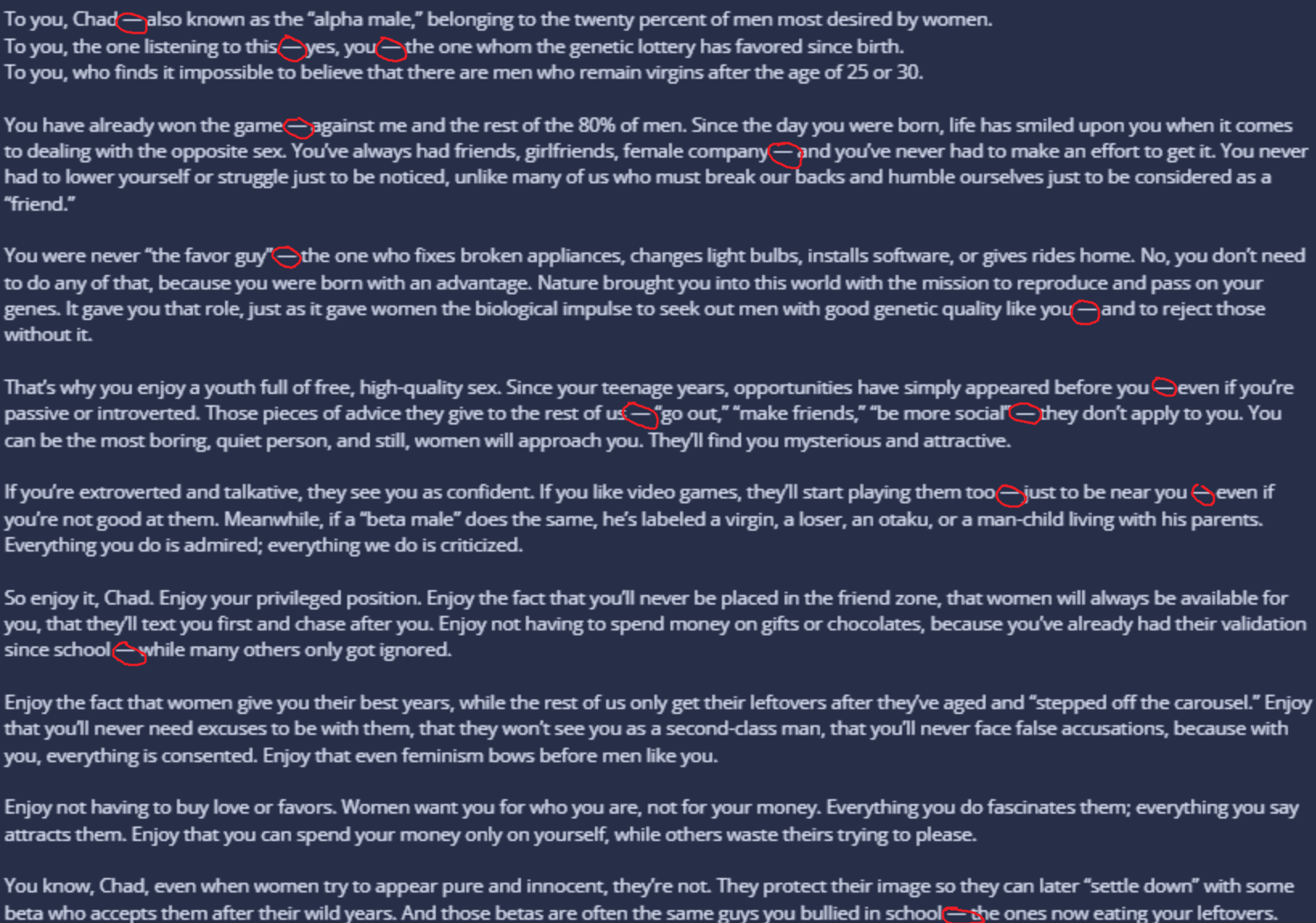 Women are abject whores and fuck anything with a pulse and purposely try to make everything bad and worse, but incels are the bad guys because they want to work a job and provide for a wife and kids and see their community prosper. Personally I find it strange. Incels only want what is good. They never do anything bad. But pedophiles, murderers, rapists, thieves, userers, violent people are praised and loved by all.