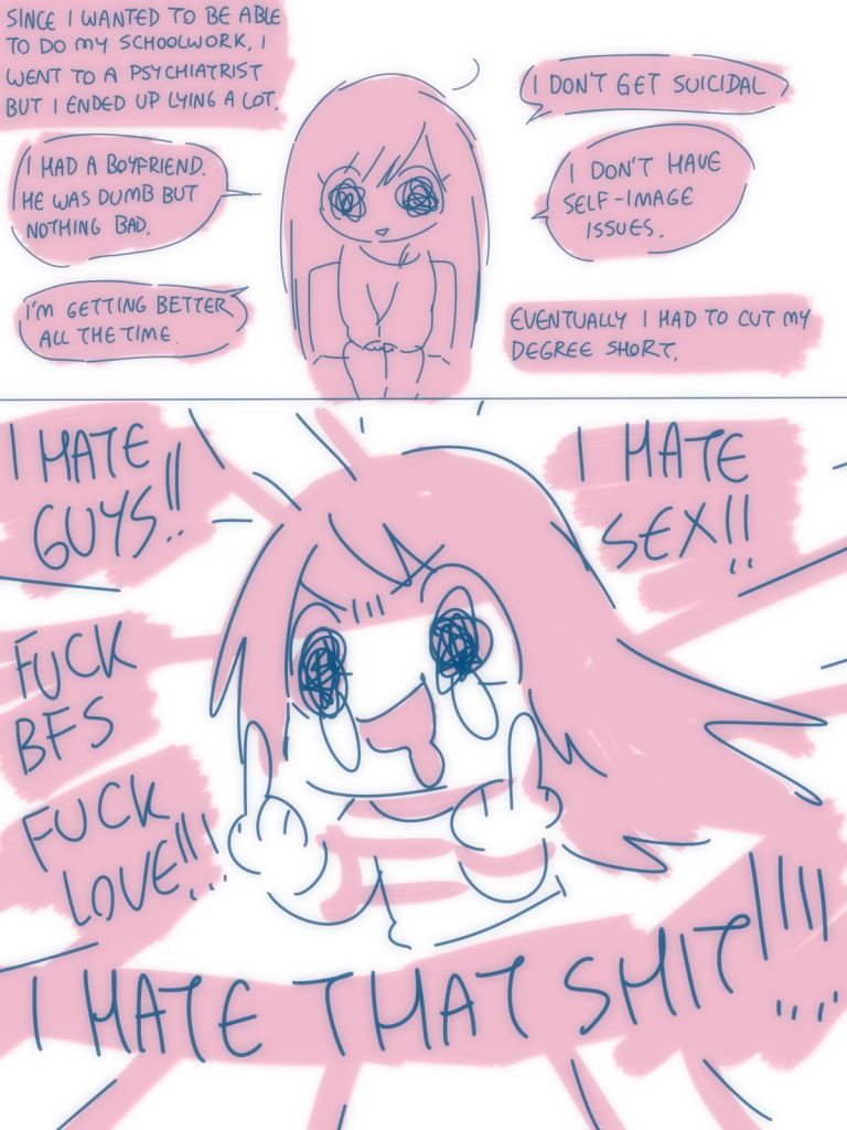 >>82933237Isn't this the comic where she complains about sex and guys but then still takes the offer to give a guy she hated a blowjob for money?