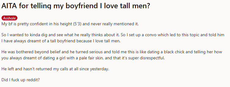>>82940535If a woman did this to me i'd tell her that if she wants a tall man she can leave. If she does leave it wasn't going to work out anyway. If she doesn't want to leave i'd make her apologize. Saying you'd essentially prefer a different partner will destroy any relationship, it's like if I told a girl I'd rather date a girl with bigger boobs, she would rightfully get angry at me.
