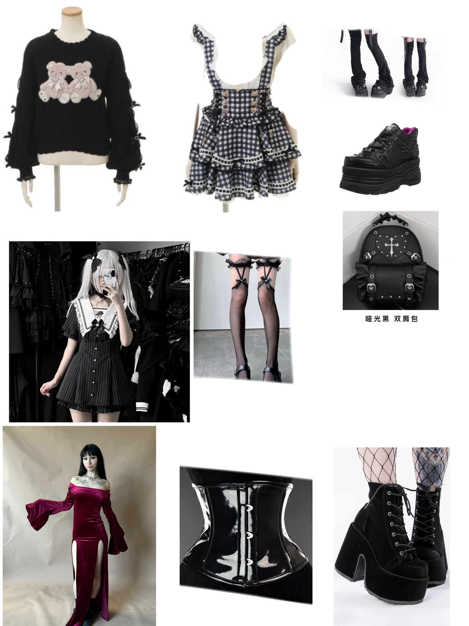 >>82958332this was very lazy but basically heres three including a goth one.the top pair of shoes and bag are used for both the top 2 outfits. i wear a crown necklace with the first outfit and i wear some black chains with the goth one>>82958467i do not because im not stupid enough to do it
