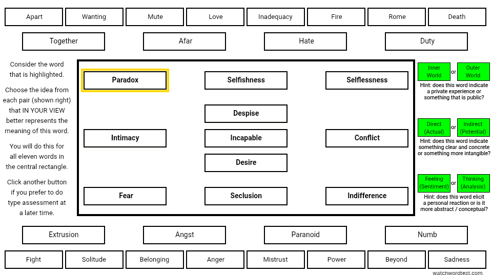 >>82980411It's really not for that, it's just tacked on for advertising. One could make a decent test out of it, but they sure didn't. The keywords are neat, but mostly a meme/more of a puzzle. The only informative thing is the levels of association. The point is your reaction/interpretation.