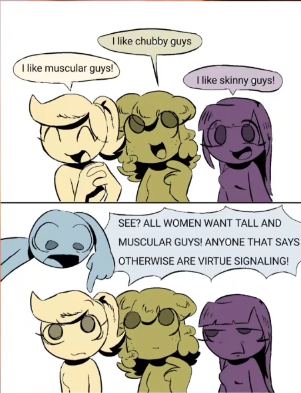 >>82980442all women want tall menthis is true for 99% of women and your blobslop comic doesn't change that