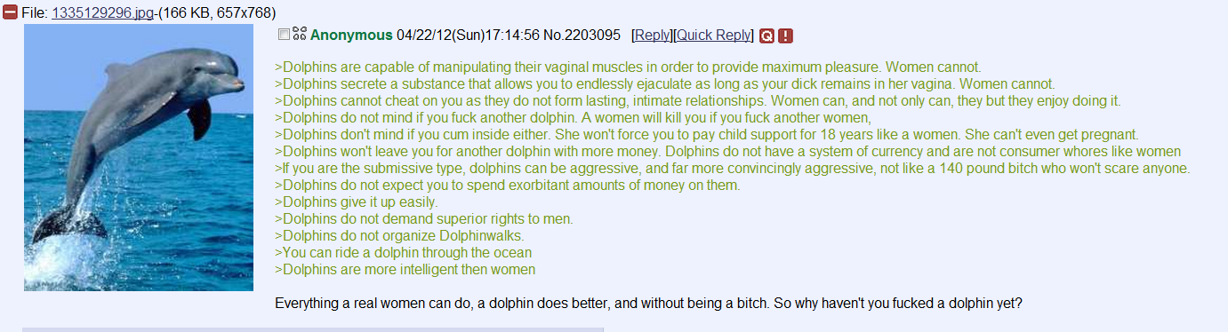 >>82985132dolphins are sexually voracious. wouldn't be surprised if that's considered an aphrodisiac.remember finding this forum dedicated to dolphin shaggers. whole community of lads who've stuck their willies inside dolphins' mammary slits.