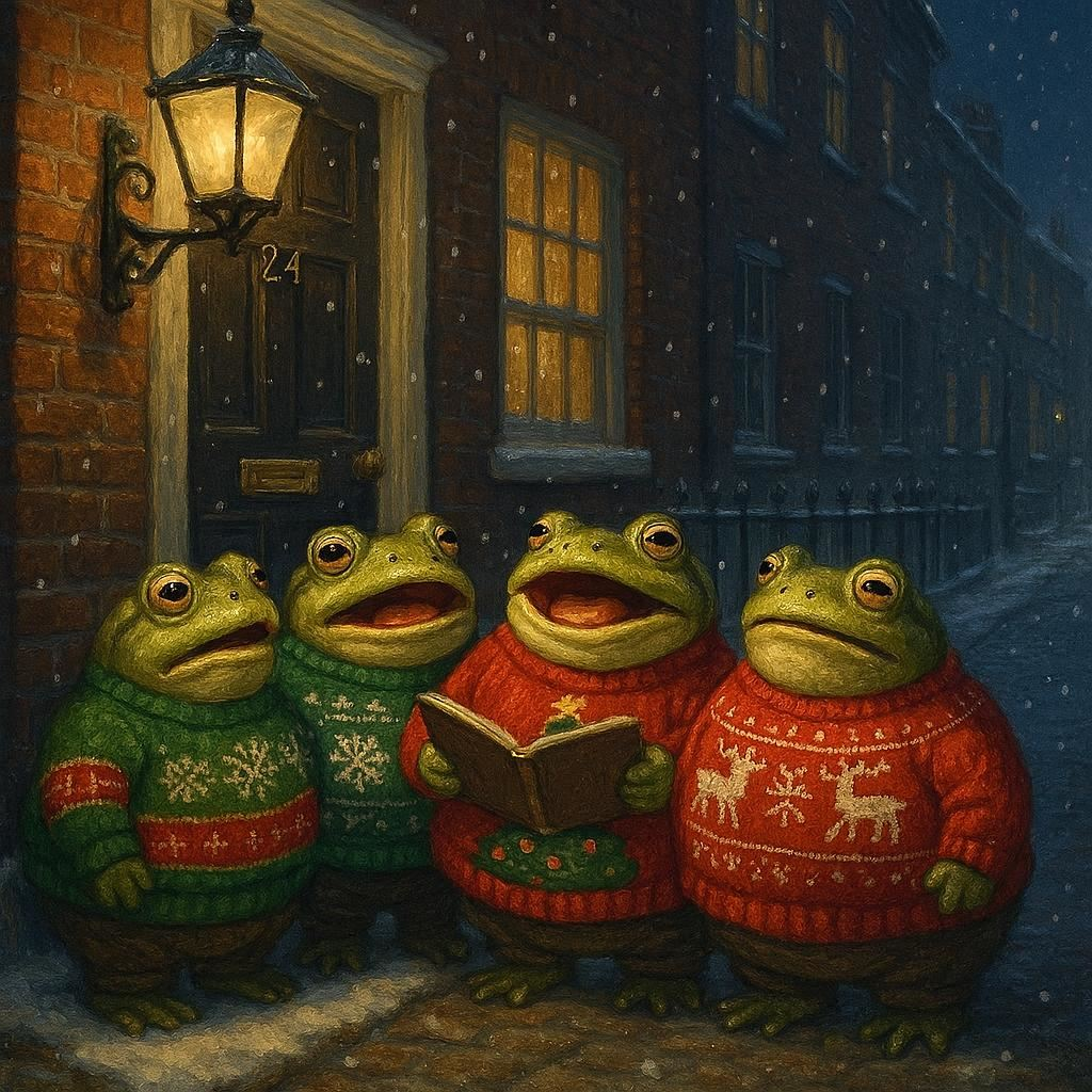 >Silent night, holy night,>All is womf, snacks alright>Round yon virgin spacker, manchild!>Holy wizza so tender and mild,>Sleep in heavenly peace,>Sleep in heavenly peace.Alri' lid. These carols ain't free. Wouldn't suppose you've got a fiver for each of us have you. Not cheap keeping the Wistmas spirit up is it? Ok lids we do one more for the nice man.>Hark! the herald Apus sing,>'Glory to the newborn Fren:>Snacks and treats, and chilli mild,>Frog and Seethers reconciled'>Joyful, all ye spackers rise,>join the triumph of the skies;>with th'angelic hosts proclaim,>"Fren is born in Wethlehem!"Rite me lid that'll be twenty quid per frog. You best pay up or we'll tell SPACCA you called us little mong boys or Fr*gg*rs.