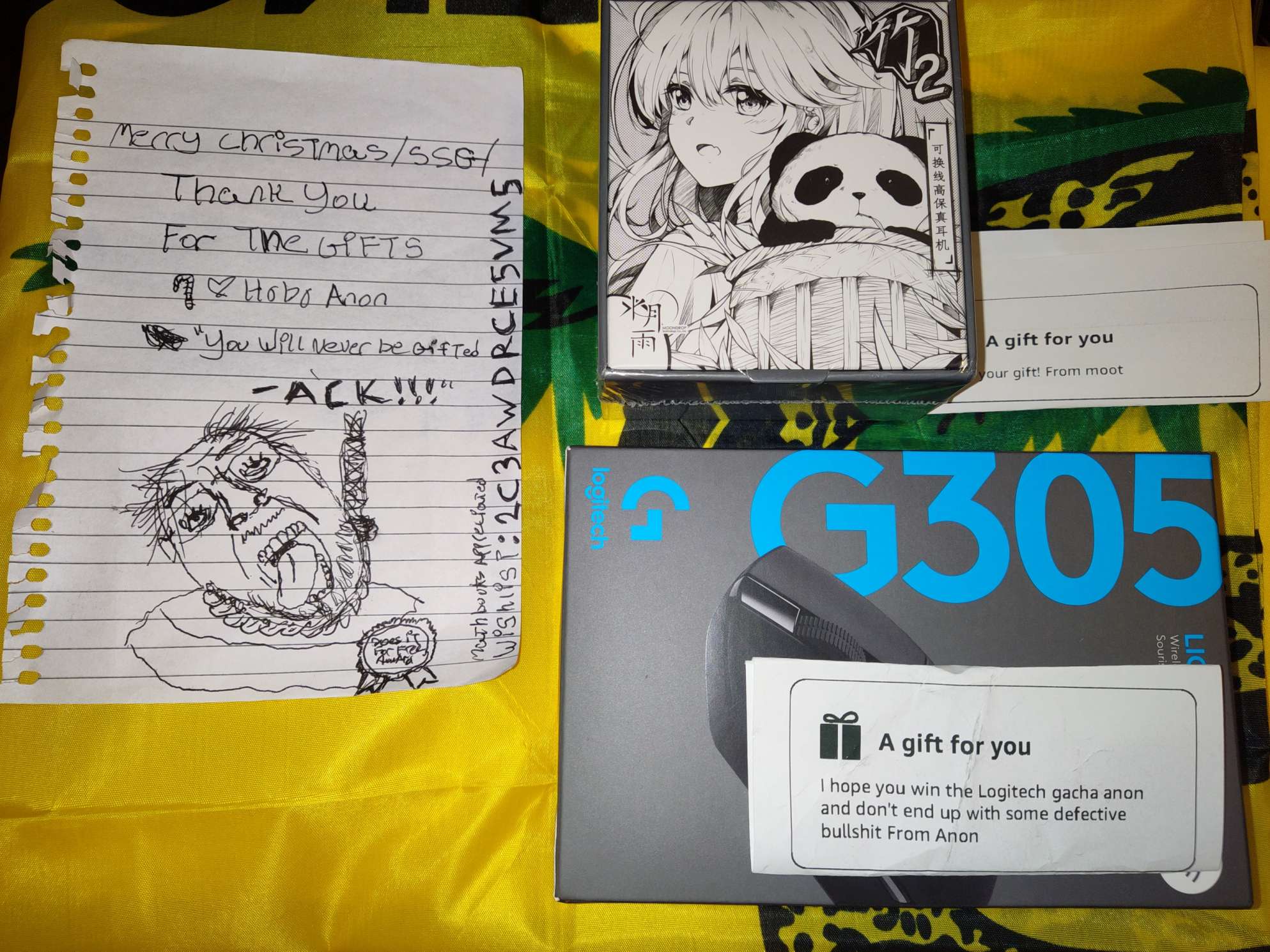 Posting for the gift collage anon, thanks again for the generosity bros ( snek flag in background was also gift ). PS: to the janitor - a little section of the note attached is just for you <3https://www.amazon.com/hz/wishlist/ls/2C3AWDRCE5VM5/