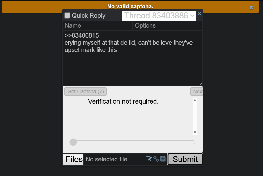 >>83408026The main issue is that when it said no verification needed, it kept saying invalid captcha. Nothing to do with solving the piss easy captcha, kek. I have said that multiple times now.