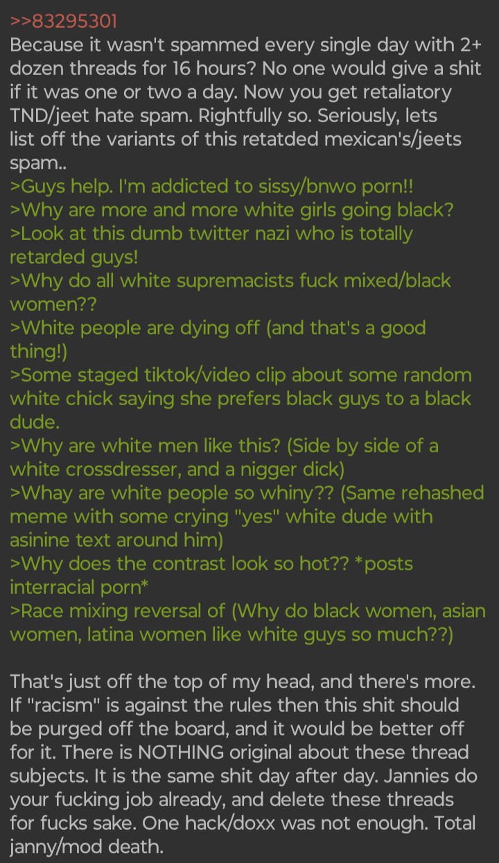 >>83422989Go spam some more threads about nigger dick, you fucking loser.