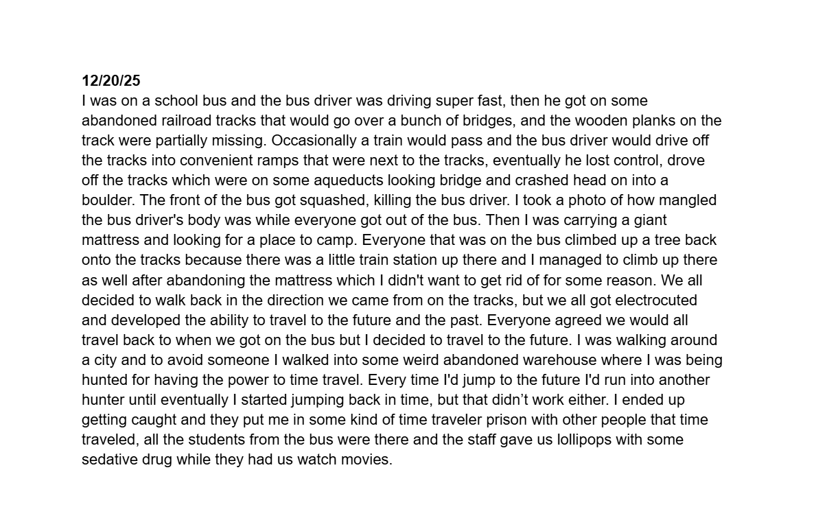 >>83436315I've been doing it for 10 years. I first started writing my dreams down because /x/ claimed it would help with lucid dreaming. Didn't get much success with it, but kept writing ever since anyway because I like keeping record of things. I also keep a normal journal, and used to track my daily activities and time spent on them with charts, but had to stop with the latter due to it taking too much of my free time.