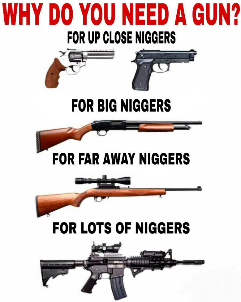 >>83439424My proposal for Safe and Sane gun control:>NO black person is allowed to own a gun. If a blax is found with a gun, they're immediately executed.bam. crime solved