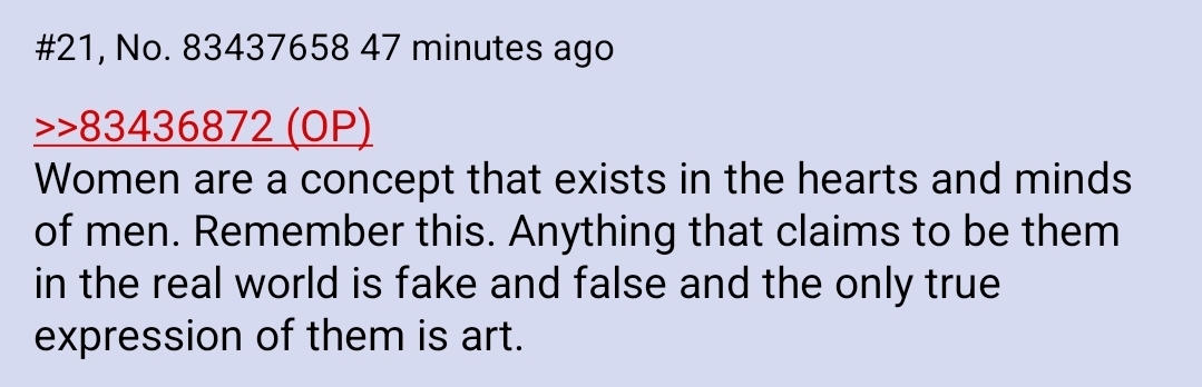>>83445291>>83445307I am still holding on too brosMaybe we are all deluded, but there is a concept of a woman that exists deep within my soul that I still believe in