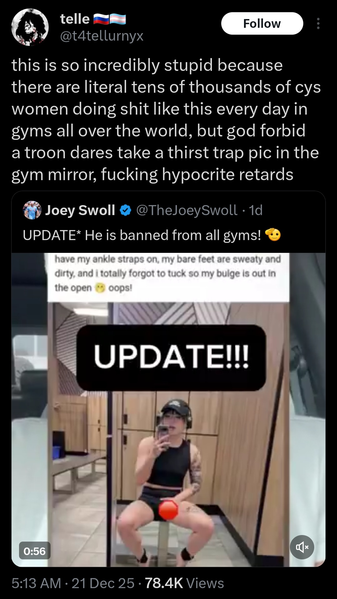 >tranny posts videos of himself jerking off and flashing himself in public gyms>gets banned from gyms everywhere for being a degenerate>trannies seethe, rushing to defend this kind of behavior>anyone who thinks this is gross and not normal is a nazi who wants to fuck tranniesAnd then they ask why people hate them.