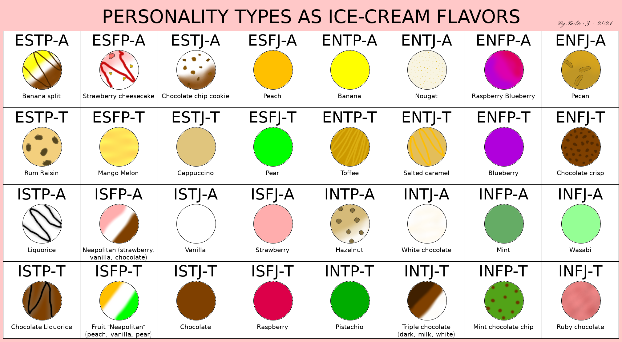 >>83458441>it's about types!You get a pass turbie because you're cute and wholesome; but, with respect, it's not about types. It gives the *appearance* of being so. How would you qualify INFJ-A as wasabi but INFJ-T as Ruby chocolate? Make that make sense