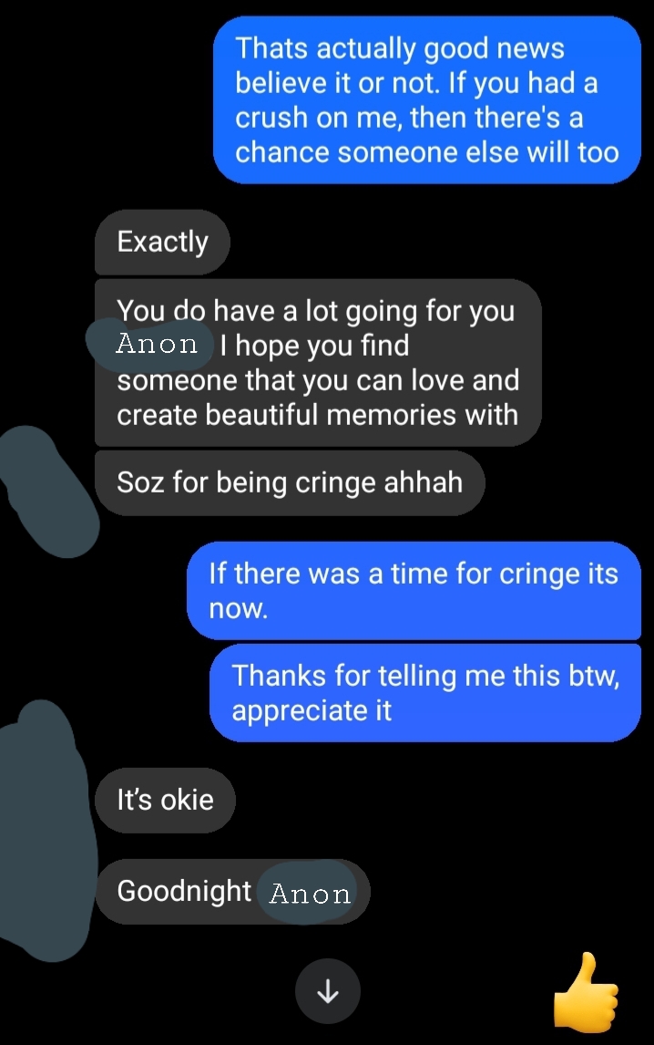 Why would she say that to me? Why would she tell me that, after all these years? Even if you didn't want to intiate out of fear of rejection, or simply for the fact that women don't initiate relationships. Why? Why would she tell me that? I think that is the worst thing I have ever heard from anyone. It still haunts me to my core after all these years.Recently got in touch with another chick from high school, and the memories are all flowing back. Currently listening to https://www.youtube.com/watch?v=LMv-6ATLw2I on repeat.Additional question, if I were to commit suicide, what would be the best platform to stream from. I have an exciting method I think the internet would enjoy