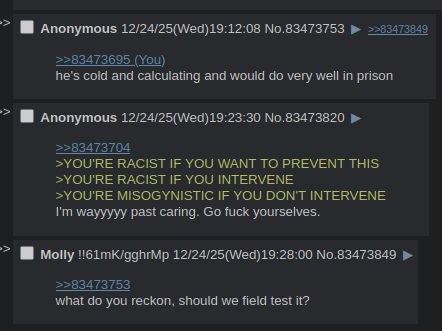 >>83473878>4chan>smart peoplelmao. maybe back in 2004 when it was harder to get on the internet. Now? the same people who used Facebook or reddit are using 4chan. its not like this website is some secret club.