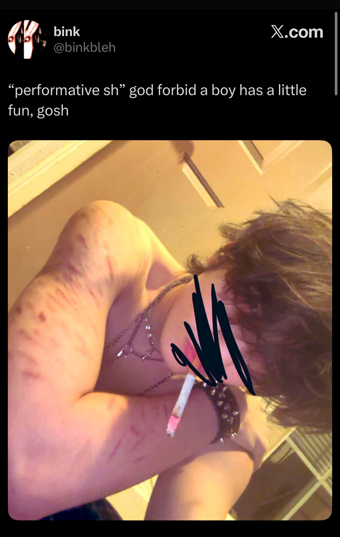 >>83478878It's for attention and one-upping other cutters, on twitter the #SHED community basically competitively cut and starve themselves to see who can be cut up the most and look like a skeleton the most, note that these communities are like 99% female aka women are encouraging other women to hurt themselves