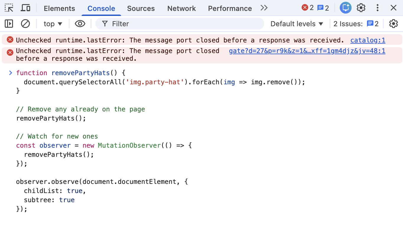 If you want to remove the party hats here is code you can use. I don't want to be reminded I am using this site on Christmas.function removePartyHats() { document.querySelectorAll('img.party-hat').forEach(img => img.remove());}// Remove any already on the pageremovePartyHats();// Watch for new onesconst observer = new MutationObserver(() => { removePartyHats();});observer.observe(document.documentElement, { childList: true, subtree: true});